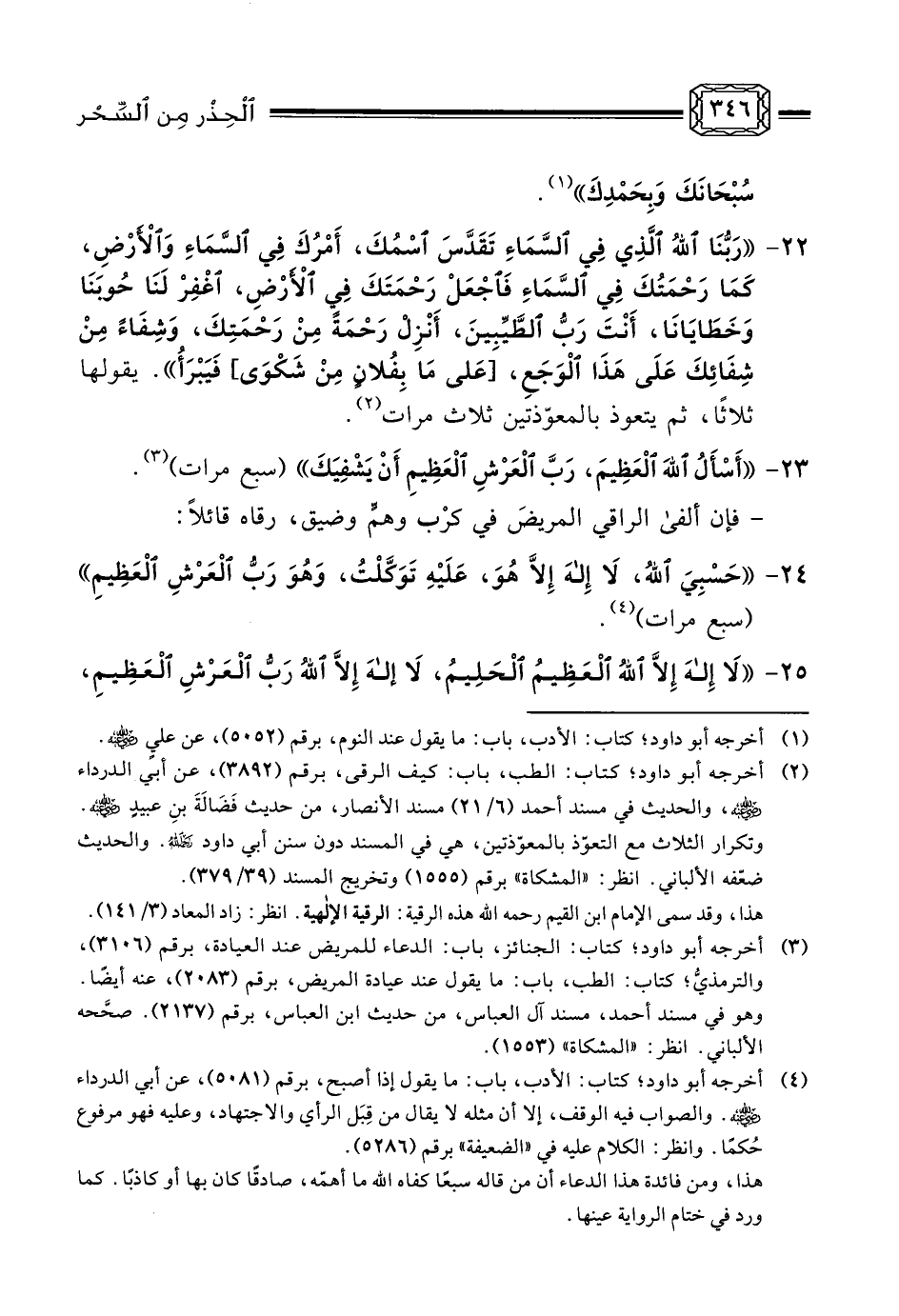 (¬2) ذكرتُ الآيتين من ختام سورة الصافات في ختام الرقية من السنة، بقصد التبرك بها، ولمناسبتها الختام، وكذلك لما روي في الحديث الضعيف الذي أخرجه الترمذي في كتاب: الصلاة، باب: ما يقول إذا سلَّم من الصلاة، برقم (299) . ونصُّ ذلك: وقد رُوي عنه صلى الله عليه وسلم أنه كان يقول: [الصَّافات: 180-182] {سُبْحَانَ رَبِّكَ رَبِّ الْعِزَّةِ عَمَّا يَصِفُونَ *وَسَلاَمٌ عَلَى الْمُرْسَلِينَ *وَالْحَمْدُ لِلَّهِ رَبِّ الْعَالَمِينَ *} .