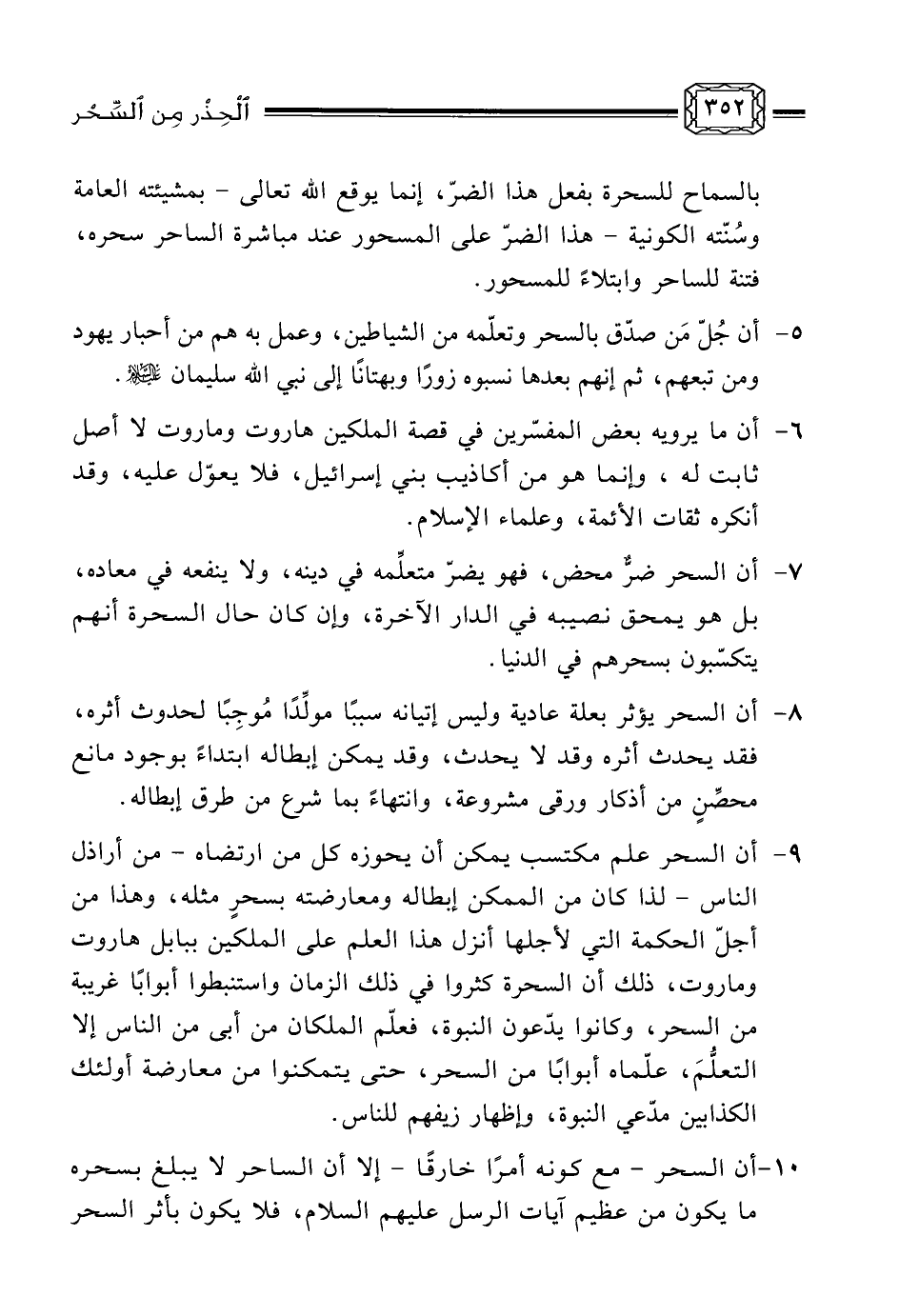 34- أن تعلّم السحر الحقيقي وتعليمه كفر، فإنه لا بد فيه من تصريح بكلام مكفّرٍ، أو القيام بعمل مكفّرٍ.