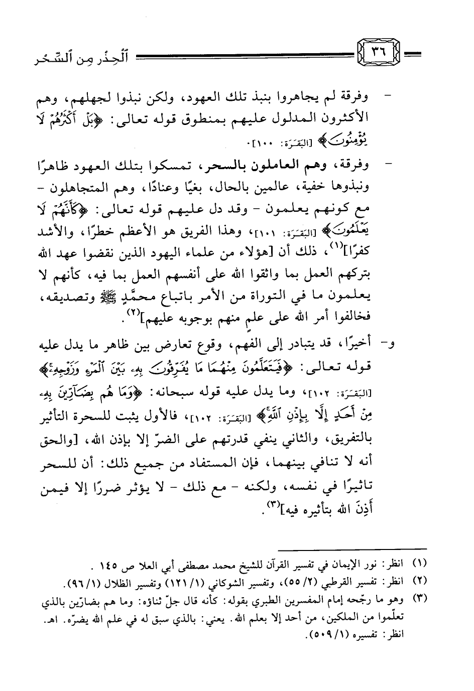 و ... أخيرًا، قد يتبادر إلى الفهم، وقوع تعارض بين ظاهر ما يدل عليه قوله تعالى: [البَقَرَة: 102] {فَيَتَعَلَّمُونَ مِنْهُمَا مَا يُفَرِّقُونَ بِهِ بَيْنَ الْمَرْءِ وَزَوْجِهِ} ، وما يدل عليه قوله سبحانه: [البَقَرَة: 102] {وَمَا هُمْ بِضَآرِّينَ بِهِ مِنْ أَحَدٍ إِلاَّ بِإِذْنِ اللَّهِ} ، فالأول يثبت للسحرة التأثير بالتفريق، والثاني ينفي قدرتهم على الضرّ إلا بإذن الله، [والحق أنه لا تنافي بينهما، فإن المستفاد من جميع ذلك: أن للسحر تاثيرًا في نفسه، ولكنه - مع ذلك - لا يؤثر ضررًا إلا فيمن أَذِنَ الله بتأثيره فيه] (¬3) .