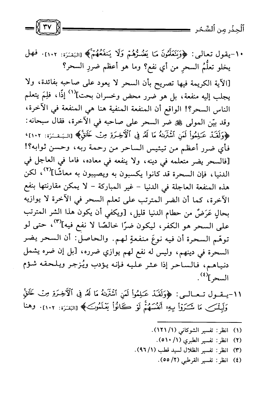 10- ... يقول تعالى: [البَقَرَة: 102] {وَيَتَعَلَّمُونَ مَا يَضُرُّهُمْ وَلاَ يَنْفَعُهُمْ} . فهل يخلو تعلُّمُ السحرِ من أي نفع؟ وما هو أعظم ضررِ السحر؟