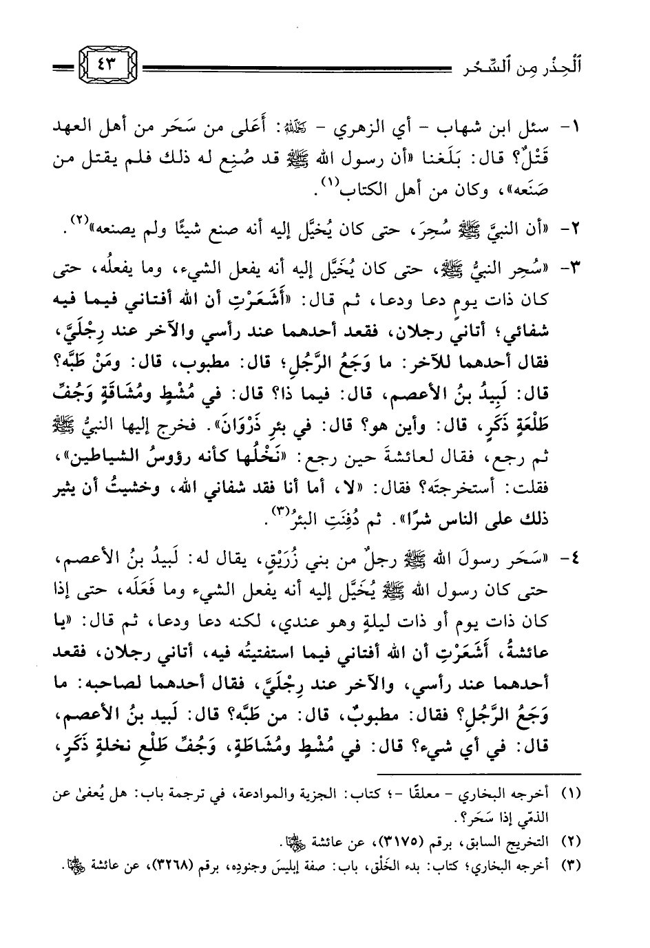1- ... سئل ابن شهاب - أي الزهري - رحمه الله: أَعَلى من سَحَر من أهل العهد قَتْلٌ؟ قال: بَلَغنا «أن رسول الله صلى الله عليه وسلم قد صُنِع له ذلك فلم يقتل من صَنَعه» ، وكان من أهل الكتاب (¬1) .