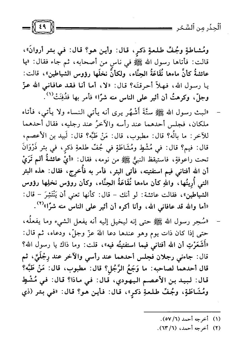 - ... أن رسول الله صلى الله عليه وسلم سُحِر له، حتى كان يخيل إليه أنه يصنع الشيء ولم يصنع، حتى إذا كان ذات يوم رأيته يدعو. فقال: «شَعَرْتُ أن الله عزّ وجلّ قد أفتاني فيما استفتيتُه فيه، فقال: أتاني رجلان، فقعد أحدهما عند رأسي، والآخر عند رِجْلَيَّ، فقال أحدهما: ما وَجَعُ الرَّجُلِ؟ قال الآخر: مطبوب، قال: مَنْ طَبَّه؟ قال: لبيد بن الأعصم، قال: في ماذا؟ قال: في مُشْطٍ ومُشَاطَةٍ، وَجُبِّ أو جُفِّ طلعةِ ذكرٍ، قال: فأين هو؟ قال: في ذي