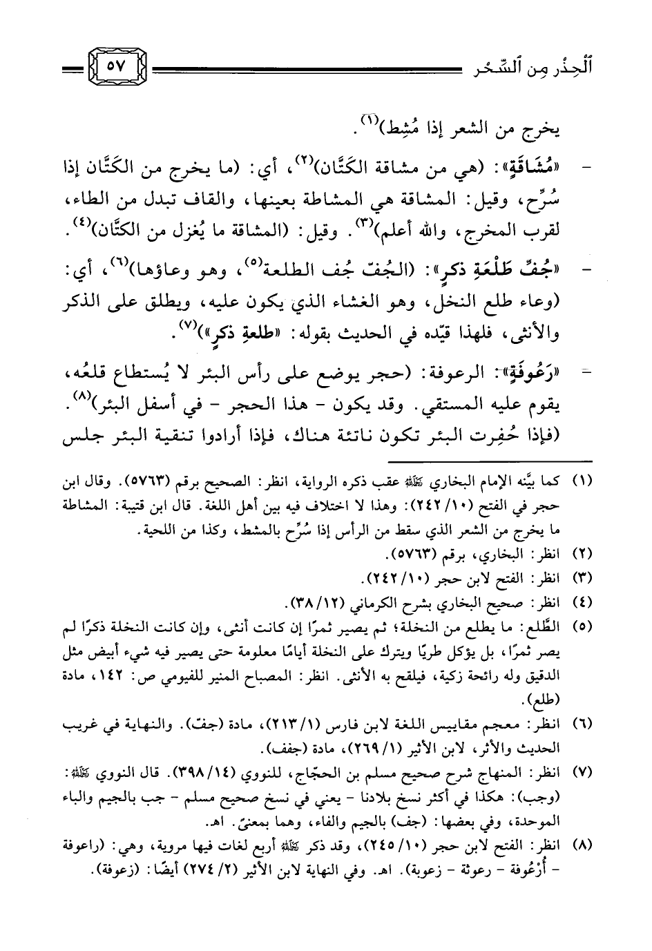 (¬8) انظر: الفتح لابن حجر (10/245) ، وقد ذكر رحمه الله أربع لغات فيها مروية، وهي: (راعوفة - أُرْعُوفة - رعوثة - زعوبة) . اهـ. وفي النهاية لابن الأثير (2/274) أيضًا: (زعوفة) .