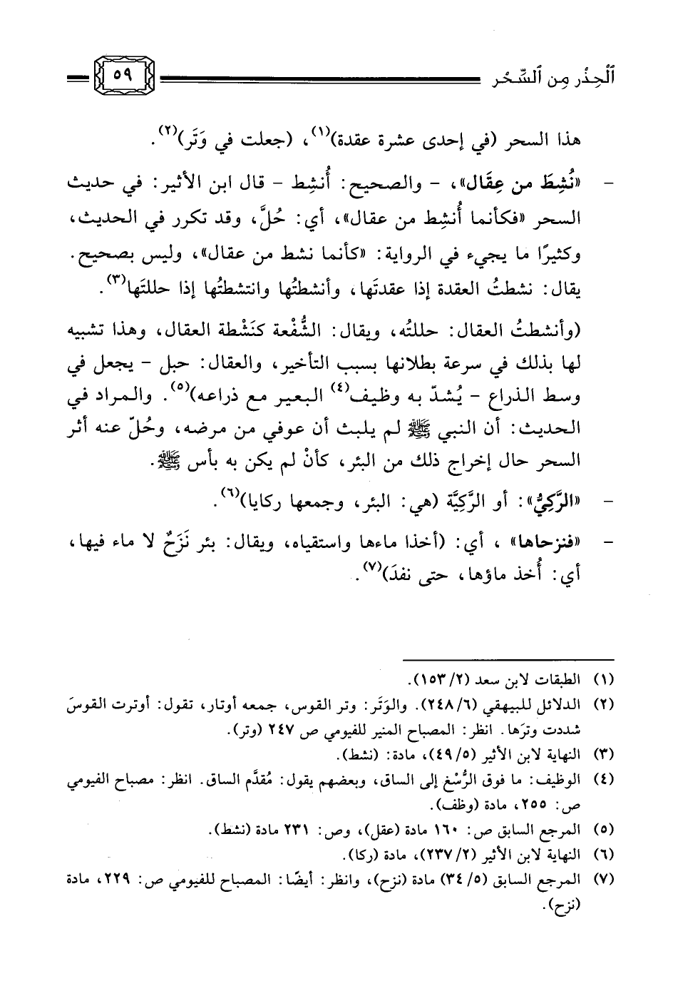 (وأنشطتُ العقال: حللتُه، ويقال: الشُّفْعة كنَشْطة العقال، وهذا تشبيه لها بذلك في سرعة بطلانها بسبب التأخير، والعقال: حبل - يجعل في وسط الذراع - يُشدّ به وظيف (¬4) البعير مع ذراعه) (¬5) . والمراد في الحديث: أن النبي صلى الله عليه وسلم لم يلبث أن عوفي من مرضه، وحُلّ عنه أثر السحر حال إخراج ذلك من البئر، كأنْ لم يكن به بأس صلى الله عليه وسلم.