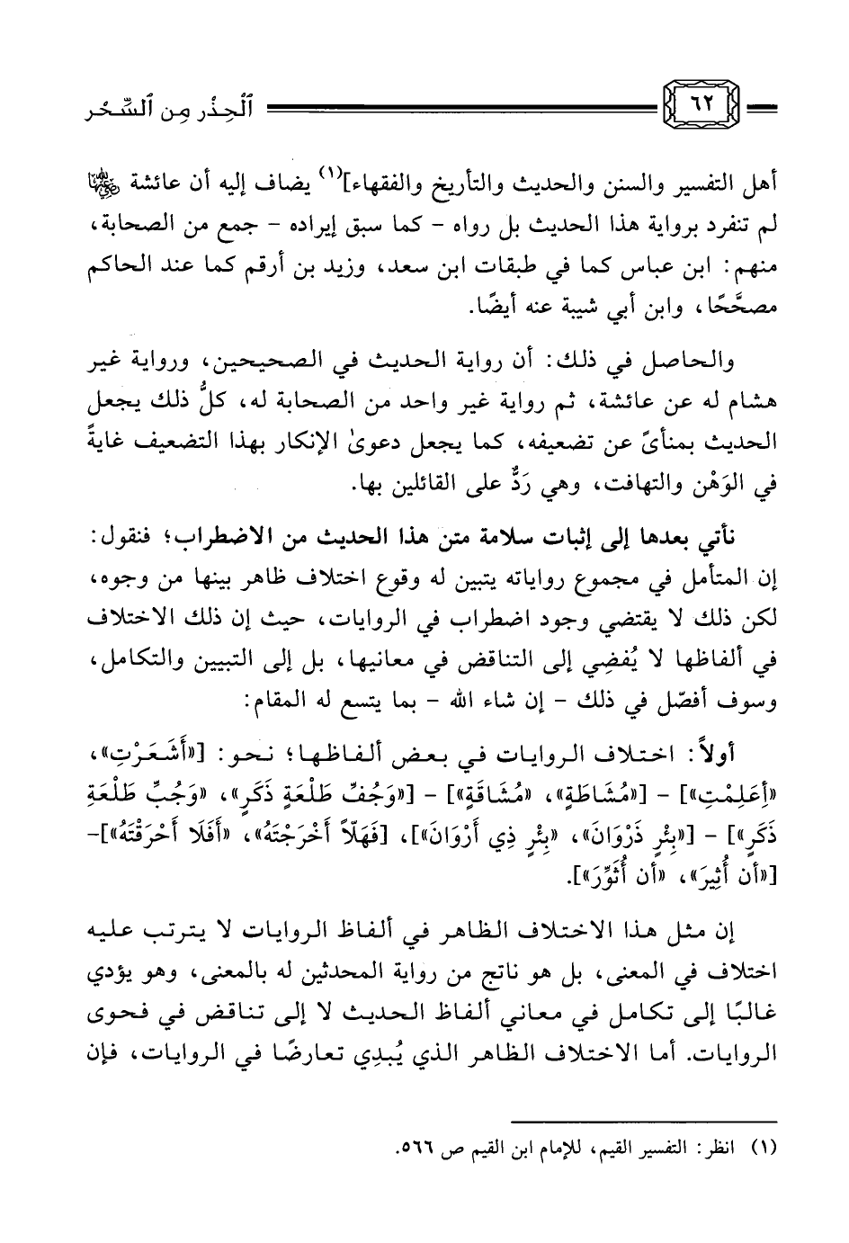 أولاً: اختلاف الروايات في بعض ألفاظها؛ نحو: [ «أَشَعَرْتِ» ، «أَِعَلِمْتِ» ]-[ «مُشَاطَةٍ» ، «مُشَاقَةٍ» ]-[ «وَجُفِّ طَلْعَةٍ ذَكَرٍ» ، «وَجُبِّ طَلْعَةِ ذَكَرٍ» ]-[ «بِئْرٍ ذَرْوَانَ» ، «بِئْرٍ ذِي أَرْوَانَ» ] ، [فَهَلاًّ أَخْرَجْتَهُ» ، «أَفَلاَ أَحْرَقْتَهُ» ]-[ «أن أُثِيرَ» ، «أن أُثَوِّرَ» ] .