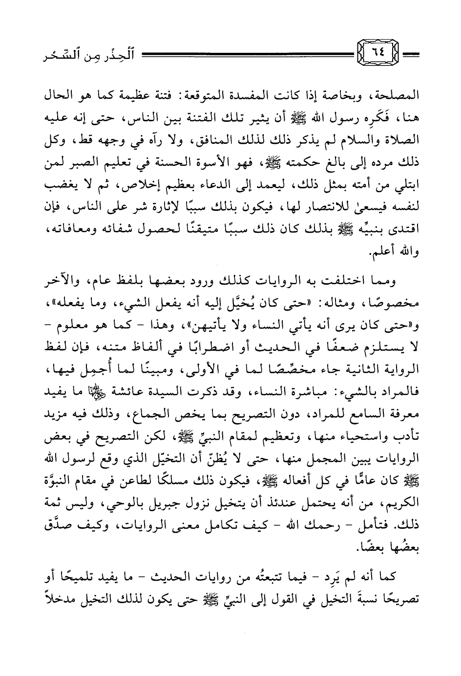 ومما اختلفت به الروايات كذلك ورود بعضها بلفظ عام، والآخر مخصوصًا، ومثاله: «حتى كان يُخيَّل إليه أنه يفعل الشيء، وما يفعله» ، و «حتى كان يرى أنه يأتي النساء ولا يأتيهن» ، وهذا - كما هو معلوم - لا يستلزم ضعفًا في الحديث أو اضطرابًا في ألفاظ متنه، فإن لفظ الرواية الثانية جاء مخصِّصًا لما في الأولى، ومبينًا لما أُجمِل فيها، فالمراد بالشيء: مباشرة النساء، وقد ذكرت السيدة عائشة رضي الله عنها ما يفيد معرفة السامع للمراد، دون التصريح بما يخص الجماع، وذلك فيه مزيد تأدب واستحياء منها، وتعظيم لمقام النبيِّ صلى الله عليه وسلم، لكن التصريح في بعض الروايات يبين المجمل منها، حتى لا يُظنّ أن التخيّل الذي وقع لرسول الله صلى الله عليه وسلم كان عامًّا في كل أفعاله صلى الله عليه وسلم، فيكون ذلك مسلكًا لطاعن في مقام النبوَّة الكريم، من أنه يحتمل عندئذ أن يتخيل نزول جبريل بالوحي، وليس ثمة ذلك. فتأمل - رحمك الله - كيف تكامل معنى الروايات، وكيف صدَّق بعضُها بعضًا.