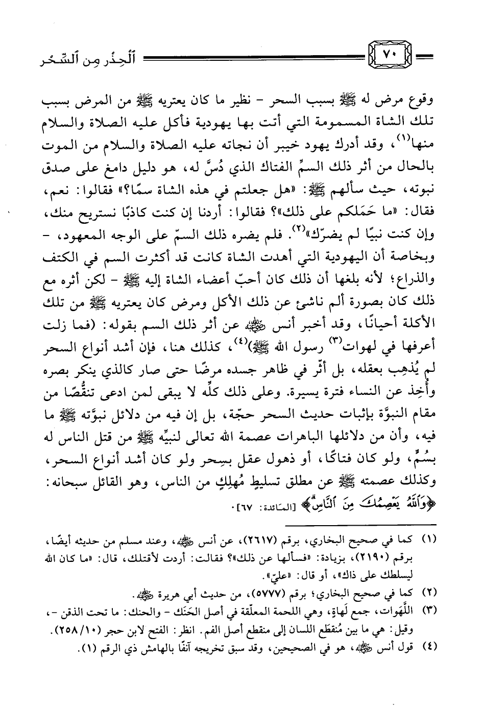 فلم يضره ذلك السمّ على الوجه المعهود، - وبخاصة أن اليهودية التي أهدت الشاة كانت قد أكثرت السم في الكتف والذراع؛ لأنه بلغها أن ذلك كان أحبّ أعضاء الشاة إليه صلى الله عليه وسلم - لكن أثره مع ذلك كان بصورة ألم ناشئ عن ذلك الأكل ومرض كان يعتريه صلى الله عليه وسلم من تلك الأكلة أحيانًا، وقد أخبر أنس رضي الله عنه عن أثر ذلك السم بقوله: (فما زلت أعرفها في لهوات (¬3) رسول الله صلى الله عليه وسلم) (¬4) ، كذلك هنا، فإن أشد أنواع السحر لم يُذهِب بعقله، بل أثّر في ظاهر جسده مرضًا حتى صار كالذي ينكر بصره وأُخِذ عن النساء فترة يسيرة. وعلى ذلك كلِّه لا يبقى لمن ادعى تنقُّصًا من مقام النبوَّة بإثبات حديث السحر حجّة، بل إن فيه من دلائل نبوَّته صلى الله عليه وسلم ما فيه، وأن من دلائلها الباهرات عصمة الله تعالى لنبيِّه صلى الله عليه وسلم من قتل الناس له بسُمٍّ، ولو كان فتاكًا، أو ذهول عقل بسِحر ولو كان أشد أنواع السحر، وكذلك عصمته صلى الله عليه وسلم عن مطلق تسليطٍ مُهلِكٍ من الناس، وهو القائل سبحانه: [المَائدة: 67] .