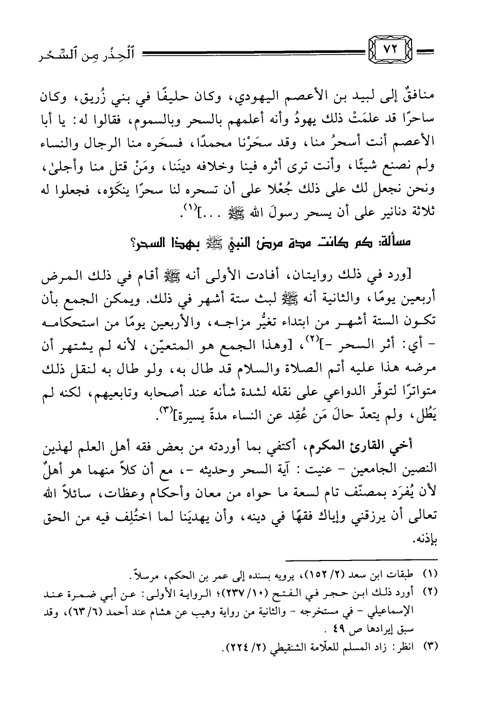 مسألة: كم كانت مدة مرض النبيِّ صلى الله عليه وسلم بهذا السحر؟