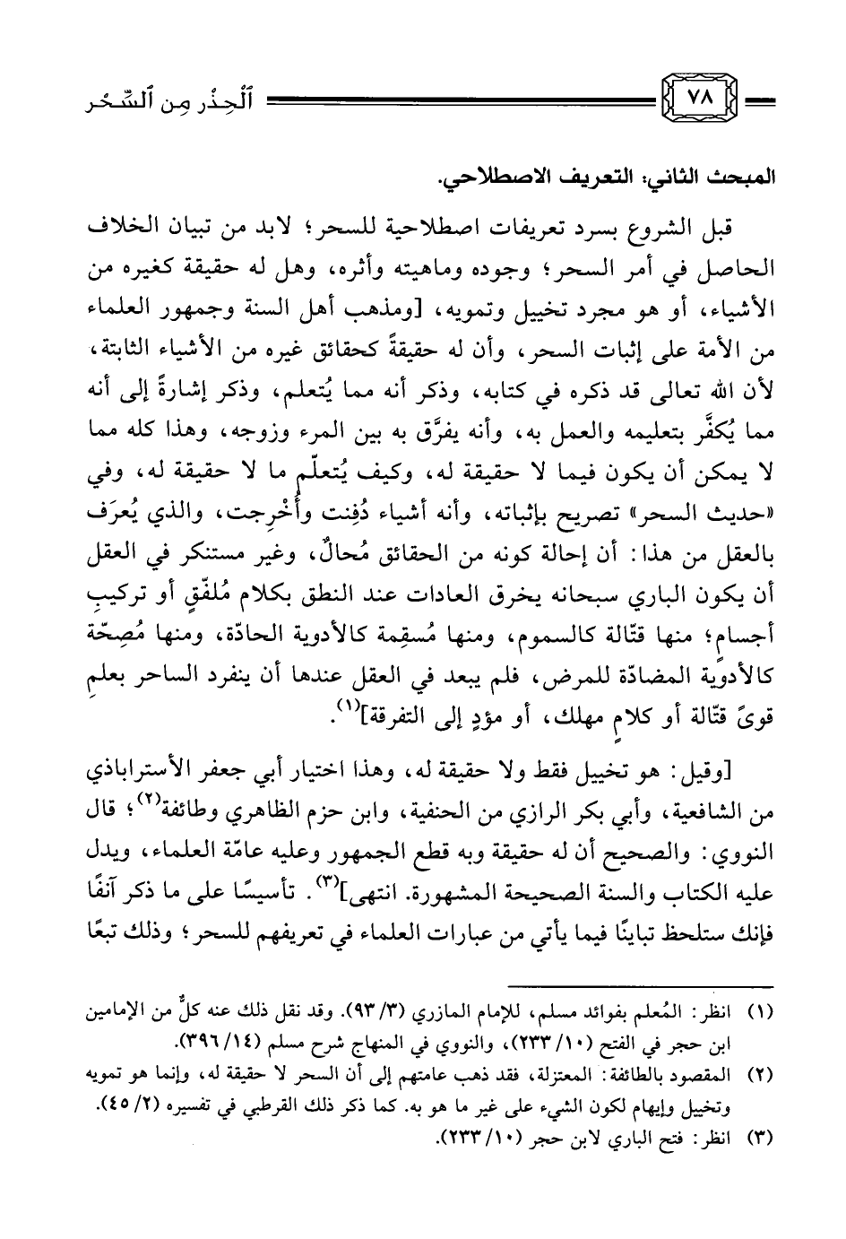 [وقيل: هو تخييل فقط ولا حقيقة له، وهذا اختيار أبي جعفر الأستراباذي من الشافعية، وأبي بكر الرازي من الحنفية، وابن حزم الظاهري وطائفة (¬2) ؛ قال النووي: والصحيح أن له حقيقة وبه قطع الجمهور وعليه عامّة العلماء، ويدل عليه الكتاب والسنة الصحيحة المشهورة. انتهى] (¬3) . تأسيسًا على ما ذكر آنفًا فإنك ستلحظ تباينًا فيما يأتي من عبارات العلماء في تعريفهم للسحر؛ وذلك تبعًا