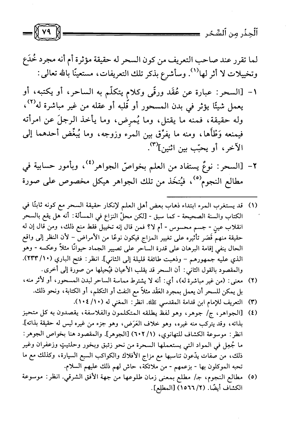 (¬1) قد يستغرب المرء ابتداء ذهاب بعض أهل العلم لإنكار حقيقة السحر مع كونه ثابتًا في الكتاب والسنة الصحيحة - كما سبق -[لكن محلّ النزاع في المسألة: أنه هل يقع بالسحر انقلاب عينٍ - جسم محسوس - أم لا؟ فمن قال إنه تخييل فقط منع ذلك، ومن قال إن له حقيقة منهم قَصَر تأثيره على تغيير المزاج فيكون نوعًا من الأمراض - لأن النظر إلى واقع الحال ينفي إقامة البرهان على قدرة الساحر على تصيير الجماد حيوانًا مثلاً وعكسه - وهو الذي عليه جمهورهم - وذهبت طائفة قليلة إلى الثاني] . انظر: فتح الباري (10/233) . والمقصود بالقول الثاني: أن السحر قد يقلب الأعيان فيُحيلها من صورة إلى أخرى.