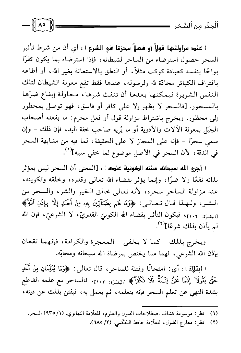 (أجرى الله سبحانه سنته الكونية عنده) : [المعنى أن السحر ليس بمؤثر بذاته نفعًا ولا ضرًا، وإنما يؤثر بقضاء الله تعالى وقدره، وخلقه وتكوينه، عند مزاولة الساحر سحره، لأنه تعالى خالق الخير والشر، والسحر من الشر، ولهذا قال تعالى: [البَقَرَة: 102] {وَمَا هُمْ بِضَآرِّينَ بِهِ مِنْ أَحَدٍ إِلاَّ بِإِذْنِ اللَّهِ} ، فيكون التأثير بقضاء الله الكونيّ القدريّ، لا الشرعيّ، فإن الله لم يأذن بذلك شرعًا] (¬2) .