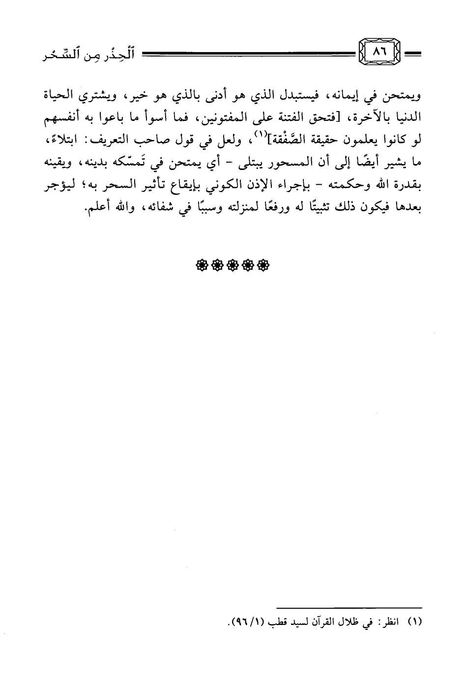 ويمتحن في إيمانه، فيستبدل الذي هو أدنى بالذي هو خير، ويشتري الحياة الدنيا بالآخرة، [فتحق الفتنة على المفتونين، فما أسوأ ما باعوا به أنفسهم لو كانوا يعلمون حقيقة الصَّفْقة] (¬1) ، ولعل في قول صاحب التعريف: ابتلاءً، ما يشير أيضًا إلى أن المسحور يبتلى - أي يمتحن في تَمسّكه بدينه، ويقينه بقدرة الله وحكمته - بإجراء الإذن الكوني بإيقاع تأثير السحر به؛ ليؤجر بعدها فيكون ذلك تثبيتًا له ورفعًا لمنزلته وسببًا في شفائه، والله أعلم.