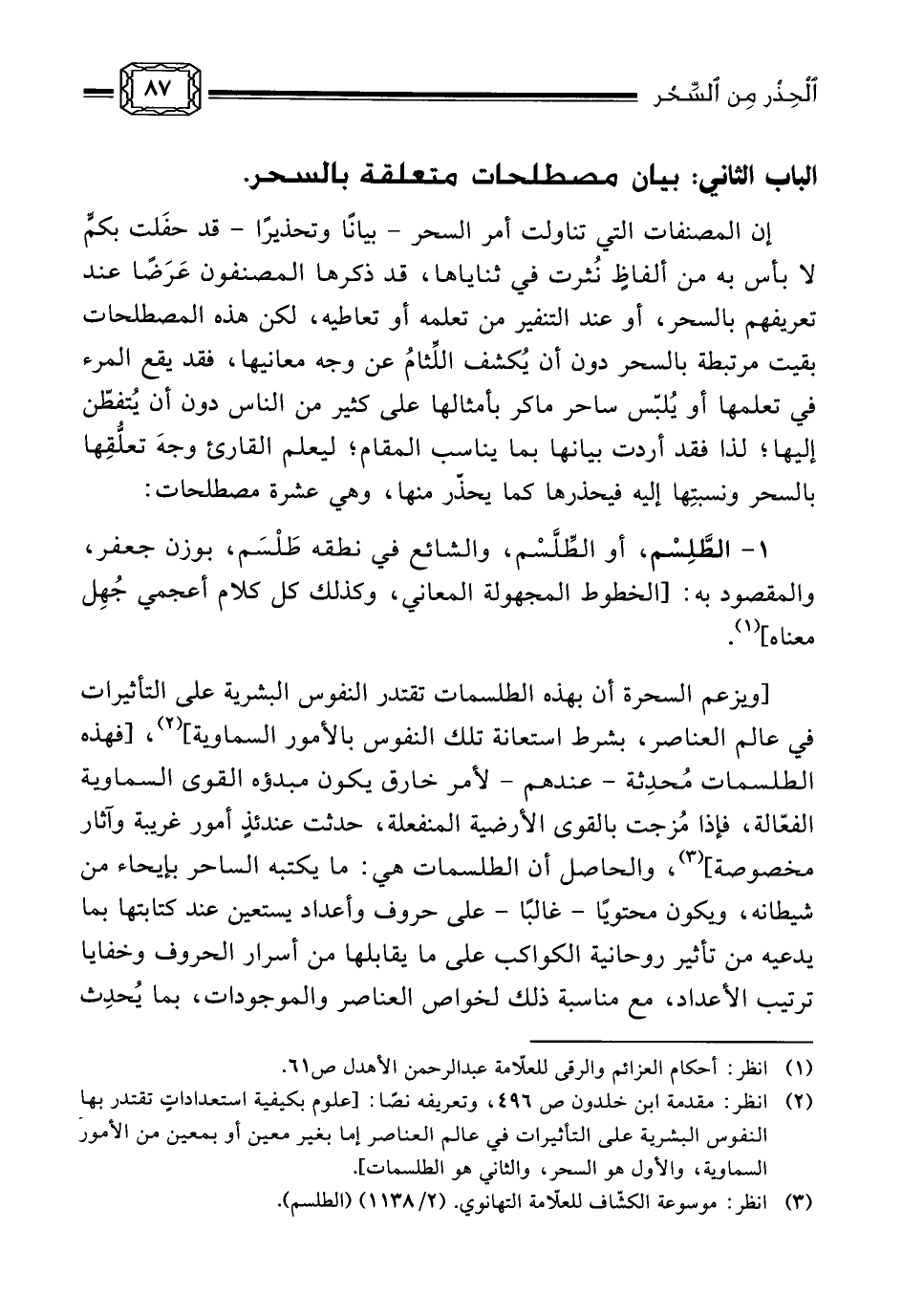 (¬2) انظر: مقدمة ابن خلدون ص 496، وتعريفه نصًا: [علوم بكيفية استعداداتٍ تقتدر بها النفوس البشرية على التأثيرات في عالم العناصر إما بغير معين أو بمعين من الأمور السماوية، والأول هو السحر، والثاني هو الطلسمات] .