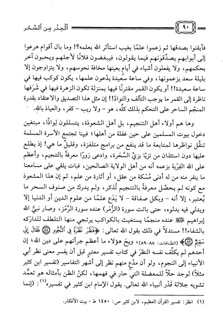 شياطينهم أكذوبةً صناعةً، فأيقنوا بصدقها ثم زعموا علمًا بغيب استأثر الله بعلمه؟! وما بال أقوام هرعوا إلى أبوابهم يصدِّقونهم فيما يقولون، فيبغضون فلانًا لأجلهم ويحبون آخر بحكمهم، ولا يفعلون أشياء في أيامٍ بعينها مخافة نحوسهم، ولا يتزاوجون إلا بليلة سعد يزعمونها، وفي ساعة سعيدة يدّعون علمها، يكون كوكب فيها في ساعة سعيدة!! أو يكون القمر مقترنًا فيها بمنزلة تكون الزهرة فيها في شَرَفها ناظرة إلى القمر ما يوجب التآلف والتوادّ!! إن مثل هذا التصديق والاعتقاد بقدرة المنجّم الساحر على التحكم بذلك كلِّه، هو - ولا ريب - كفر، والعياذ بالله.