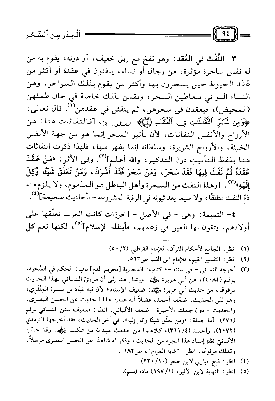 (¬3) [هذا ما يؤثر عن عمر رضي الله عنه، في معنى الجبت، وقال العلاّمة الجوهري في الصحاح: «الجبت» : كلمة تقع على الصنم والكاهن والسّاحر، ونحو ذلك، وهذا ليس من محض العربية، لاجتماع الجيم والتاء في كلمة واحدة من غير حرف ذَوْلَقِيّ] . انظر: تفسير ابن كثير ص 434، ط - بيت الأفكار. وحروف الإذلاق - كما هو معلوم - مجموعة في قولك: [فِرْ مِنْ لُبّ] . ... [وهذه المعاني للجبت لا منافاه بينها، لأن العيافة والطّرق من عمل الكهان، والكاهن عامل بالسحر، والسحر من عمل الشيطان، كما أن عبادة الصنم هي شرك من عمل الشيطان] . انظر: معارج القبول للعلاّمة الحكمي (2/706) .