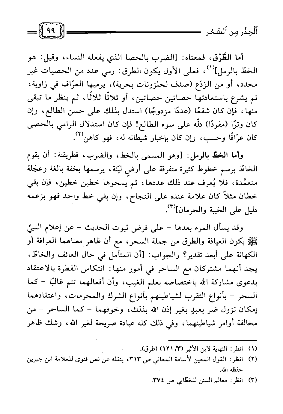 أخي القارئ، أقتصر على ذكر هذه المصطلحات الإحدى عشر، علمًا أن ما يتعلق بأمر السحر من ألفاظ يتداولها أهلها ويخطّونها في مصنفاتهم لا تكاد تنحصر، لكن أردت بيان ما اشتهر منها، كما سأبين - إن شاء الله - في الفصل التالي - أنواع علوم متعلقة بالسحر، تفنى أعمار أهل الشر في تلقيها وإتقانها والعمل بها قد سمَّوْها - زورًا - علومًا عُلْوية روحانية، وأسرارًا مكتومة لَدُنِّية!!