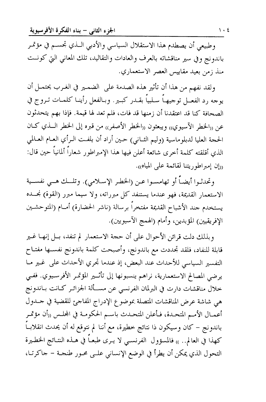 وبذلك دلت قرائن الأحوال على أن حجة الاستعمار لم تنفد، بل إنها غير قابلة للنفاد، فلقد تجددت مع باندونج، وأصبحت كلمة باندونج نفسها مفتاح التفسير السياسى للأحداث عند البعض، إذ عندما تجري الأحداث على غير ما يرضي المصالح الاستعمارية، نراهم ينسبونها إلى تأثير المؤتمر الأفرسيوي. ففى خلال مناقشات دارت في البرلمان الفرنسي عن مسألة الجزائر كانت باندونج هي شاشة عرض المناقشات المتصلة بموضوع الإدراج المفاجئ للقضية في جدول أعمال الأمم المتحدة، فأعلن المتحدث باسم الحكومة في المجلس ((أن مؤتمر باندونج - كان وسيكون ذا نتائج خطيرة، مع أننا لم نتوقع له أن يحدث انقلاباً كهذا في العالم .. )) فالمسؤول الفرنسي لا يرى طبعاً في هذه النتائج الخطيرة التحول الذي يمكن أن يطرأ في الوضع الإنساني على محور طنجة - جاكرتا،