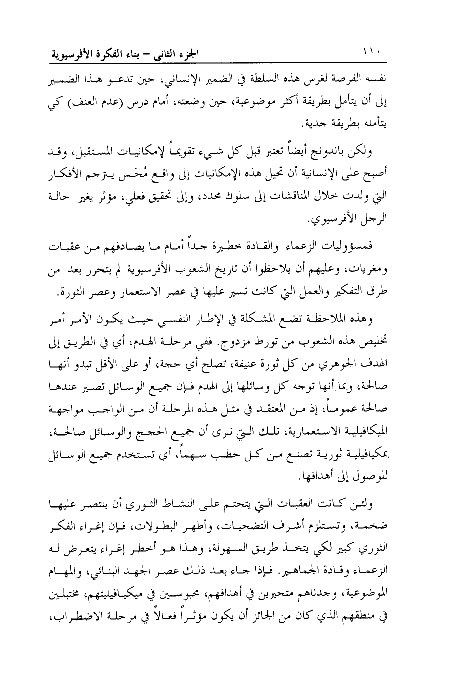 فمسؤوليات الزعماء والقادة خطيرة جداً أمام ما يصادفهم من عقبات ومغريات، وعليهم أن يلاحظوا أن تاريخ الشعوب الأفرسيوية لم يتحرر بعد من طرق التفكير والعمل التي كانت تسير عليها في عصر الاستعمار وعصر الثورة. وهذه الملاحظة تضع المشكلة في الإطار النفسي حيث يكون الأمر أمر تخليص هذه الشعوب من تورط مزدوج. ففي مرحلة الهدم، أي في الطريق إلى الهدف الجوهري من كل ثورة عنيفة، تصلح أي حجة، أو على الأقل تبدو أنها صالحة، وبما أنها توجه كل وسائلها إلى الهدم فإن جميع الوسائل تصير عندها صالحة عموماً، إذ من المعتقد في مثل هذه المرحلة أن من الواجب مواجهة الميكافيلية الاستعمارية، تلك التي ترى أن جميع الحجج والوسائل صالحة، بمكيافيلية ثورية تصنع من كل حطب سهماً، أي تستخدم جميع الوسائل للوصول إلى أهدافها.