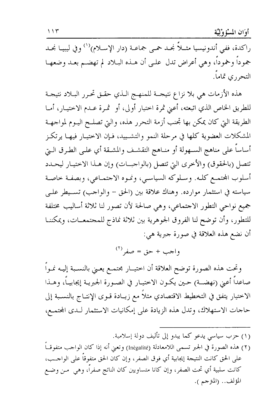 هذه الأزمات هي بلا نزاع نتيجة للمنهج الذي حقق تحرر البلاد نتيجة للطريق الخاص الذي اتبعته، أعني ثمرة اختيار أولى، أو ثمرة عدم الاختيار، أما الطريقة التي كان يمكن بها تجنب أزمة التحرر هذه، والتي تصلح اليوم لمواجهة المشكلات العضوية كلها في مرحلة النمو والتشييد، فإن الاختيار فيها يرتكز أساساً على مناهج السهولة أو مناهج التقشف والمشقة أي على الطرق التي تتصل (بالحقوق) والأخرى التي تتصل (بالواجبات) وإن هذا الاختيار ليحدد أسلوب المجتمع كله. وسلوكه السياسي، ونموه الاجتماعي، وبصفة خاصة سياسته في استثمار موارده. وهناك علاقة بين (الحق- والواجب) تسيطر على جميع نواحي التطور الاجتماعي، وهي صالحة لأن تصور لنا ثلاثة أساليب مختلفة للتطور، وأن توضح لنا الفروق الجوهرية بين ثلاثة نماذج للمجتمعات، ويمكننا أن نضع هذه العلاقة في صورة جبرية هي: