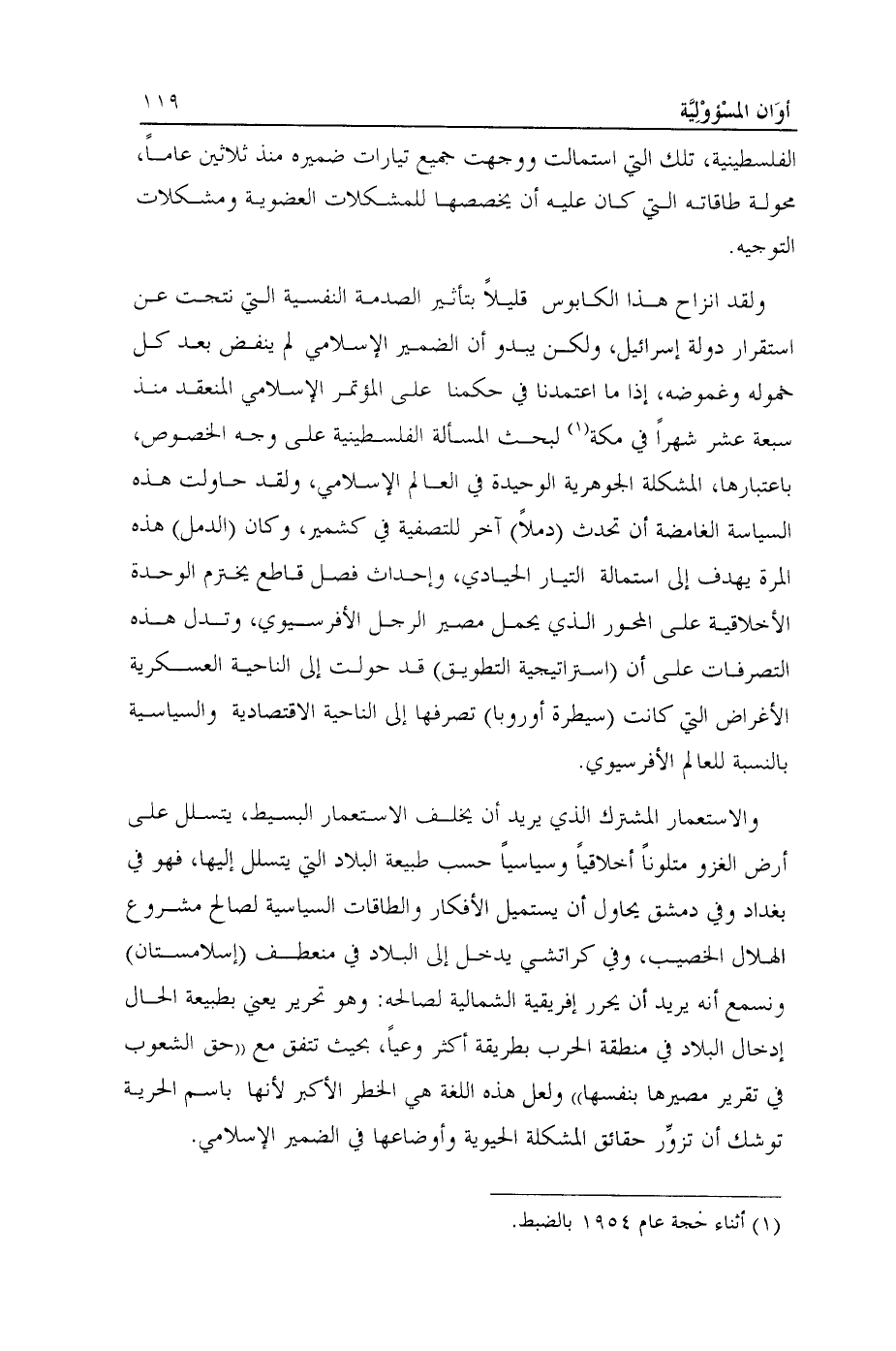 ولقد انزاح هذا الكابوس قليلاً بتأثير الصدمة النفسية التي نتجت عن استقرار دولة إسرائيل، ولكن يبدو أن الضمير الإسلامي لم ينفض بعد كل خموله وغموضه، إذا ما اعتمدنا في حكمنا على المؤتمر الإسلامي المنعقد منذ سبعة عشر شهراً في مكة (¬1) لبحث المسألة الفلسطينية على وجه الخصوص، باعتبارها، المشكلة الجوهرية الوحيدة في العالم الإسلامي، ولقد حاولت هذه السياسة الغامضة أن تحدث (دملاً) آخر للتصفية في كشمير، وكان (الدمل) هذه المرة يهدف إلى استمالة التيار الحيادي، وإحداث فصل قاطع يخترم الوحدة الأخلاقية على المحور الذي يحمل مصير الرجل الأفرسيوي، وتدل هذه التصرفات على أن (استراتيجية التطويق) قد حولت إلى الناحية العسكرية الأغراض التي كانت (سيطرة أوروبا) تصرفها إلى الناحية الاقتصادية والسياسية بالنسبة للعالم الأفرسيوي.