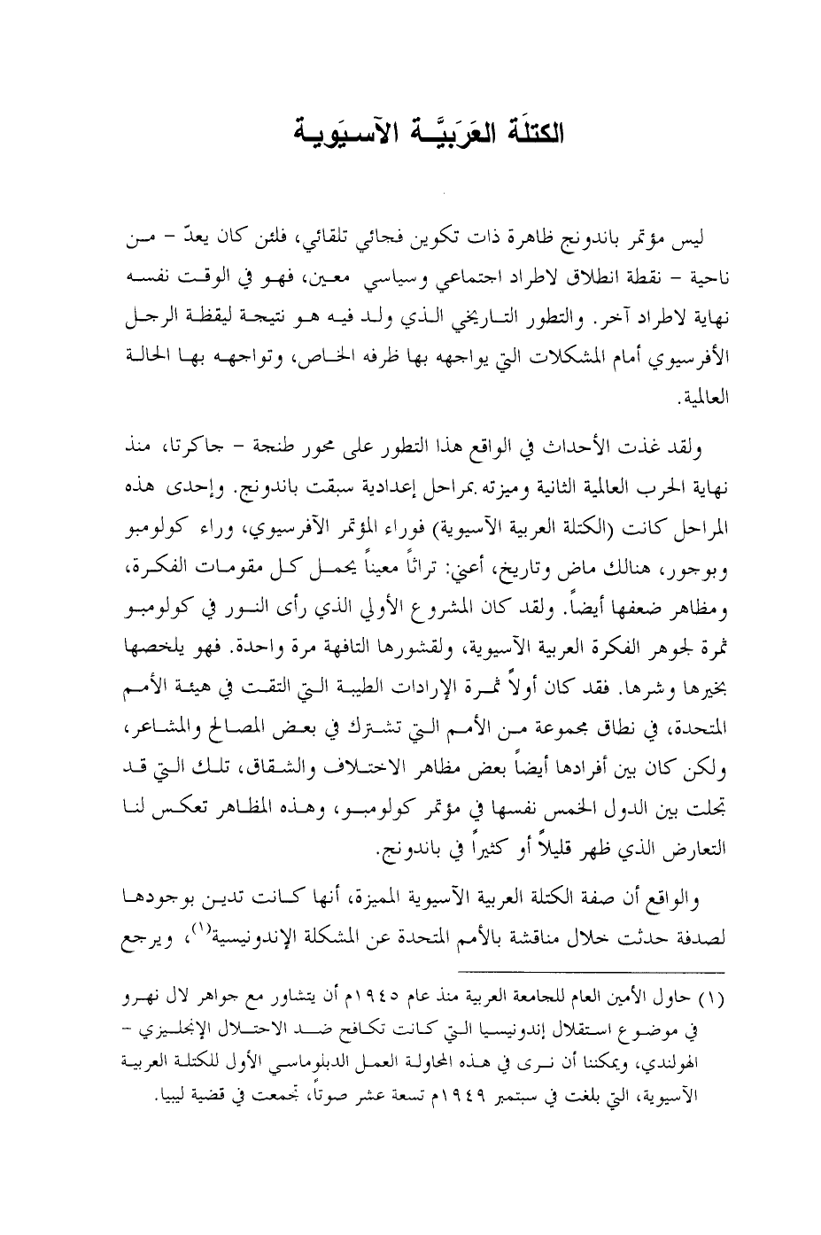 (¬1) حاول الأمين العام للجامعة العربية منذ عام 1945م أن يتشاور مع حواهر لال نهرو في موضوع استقلال إندونيسيا التي كانت تكافح ضد الاحتلال الإنجليزي- الهولندي، ويمكننا أن نرى في هذه المحاولة العمل الدبلوماسي الأول للكتلة العربية الآسيوية، التي بلغت في سبتمبر 1949م تسعة عشر صوتاً، تجمعت في قضية ليبيا.