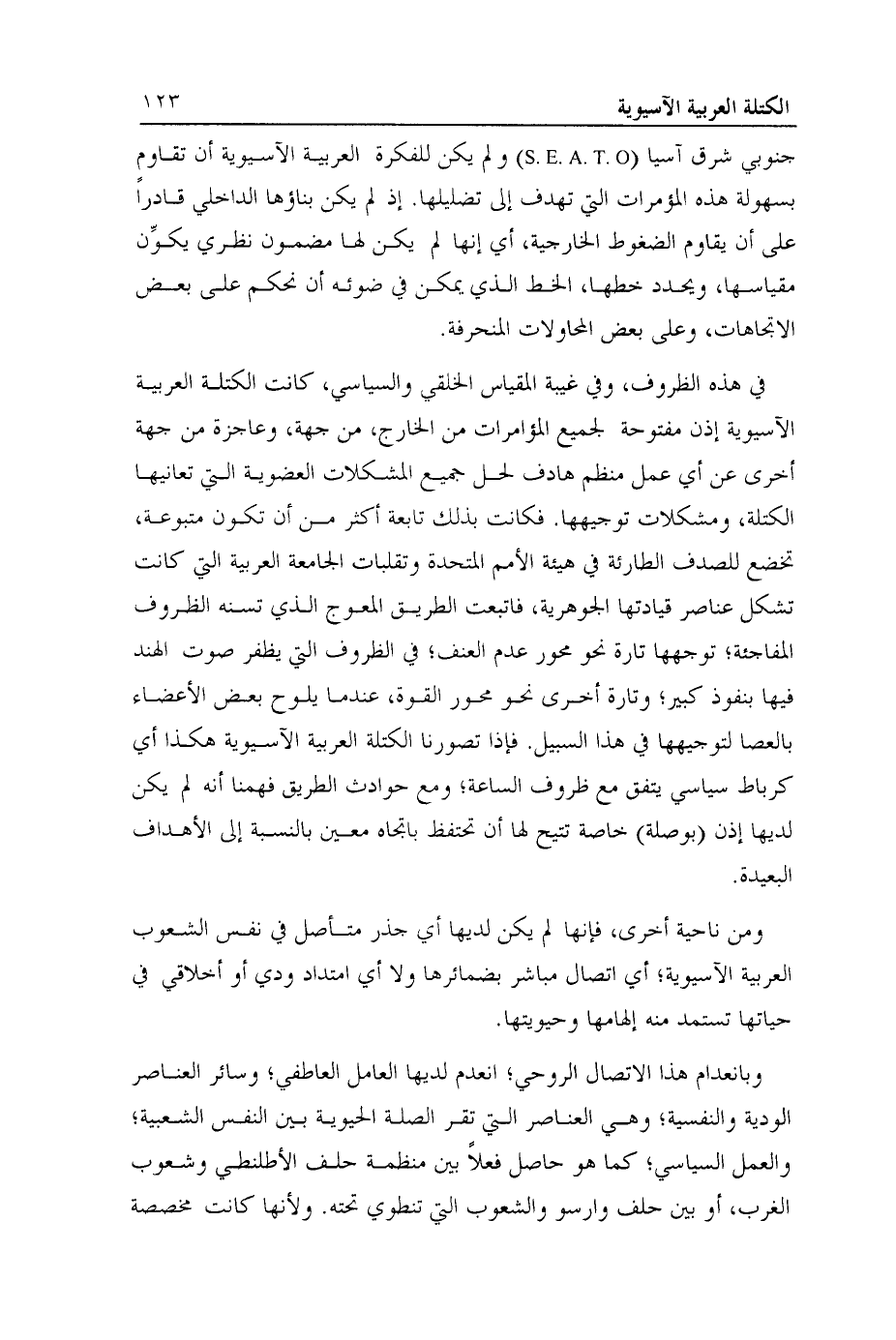 جنوبي شرق آسيا ( S.E.A.T.O) ولم يكن للفكرة العربية الآسيوية أن تقاوم بسهولة هذه المؤمرات التي تهدف إلى تضليلها. إذ لم يكن بناؤها الداخلي قادرا على أن يقاوم الضغوط الخارجية، أي إنها لم يكن لها مضمون نظري يكوِّن مقياسها، ويحدد خطها، الخط الذي يمكن في ضوئه أن نحكم على بعض الاتجاهات، وعلى بعض المحاولات المنحرفة.