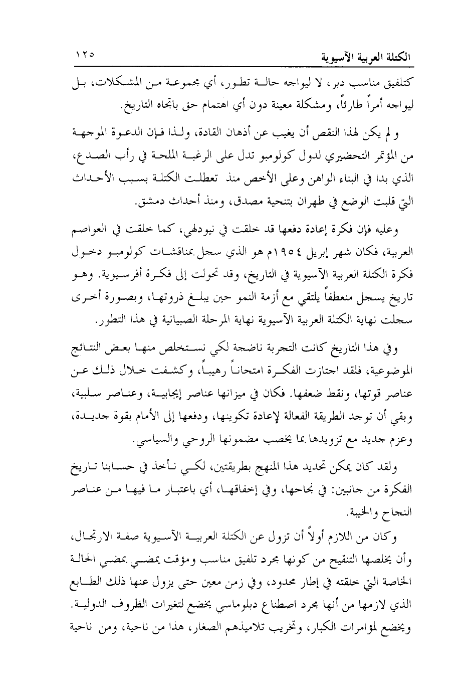 وعليه فإن فكرة إعادة دفعها قد خلقت في نيودلهي، كما خلقت في العواصم العربية، فكان شهر إبريل 1954م هو الذي سجل بمناقشات كولومبو دخول فكرة الكتلة العربية الآسيوية في التاريخ، وقد تحولت إلى فكرة أفرسيوية. وهو تاريخ يسجل منعطفاً يلتقي مع أزمة النمو حين يبلغ ذروتها، وبصورة أخرى سجلت نهاية الكتلة العربية الآسيوية نهاية المرحلة الصبيانية في هذا التطور.