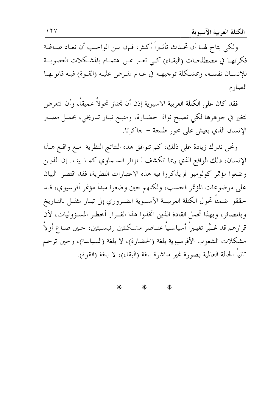 ونحن ندرك زيادة على ذلك، كم تتوافق هذه النتائج النظرية مع واقع هذا الإنسان، ذلك الواقع الذي ربما انكشف للزائر السماوي كما بينا. إن الذين وضعوا مؤتمر كولومبو لم يذكروا فيه هذه الاعتبارات النظرية، فقد اقتصر البيان على موضوعات المؤتمر فحسب، ولكنهم حين وضعوا مبدأ مؤتمر أفرسيوي، قد حققوا ضمناً تحول الكتلة العربية الآسيوية الضروري إلى تيار مثقل بالتاريخ وبالمصائر، وبهذا تحمل القادة الذين اتخذوا هذا القرار أخطر المسؤوليات، لأن قرارهم قد غيَّر تغييراً أسياسياً عناصر مشكلتين رئيسيتين، حين صاغ أولاً مشكلات الشعوب الأفرسيوية بلغة (الحضارة)، لا بلغة (السياسة)، وحين ترجم ثانياً الحالة العالمية بصورة غير مباشرة بلغة (البقاء)، لا بلغة (القوة).
