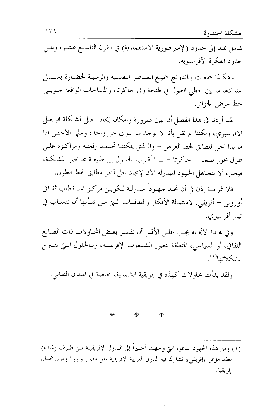 لقد أردنا في هذا الفصل أن نبين ضرورة وإمكان إيجاد حل لمشكلة الرجل الأفرسيوي، ولكننا لم نقل بأنه لا يوجد لها سوى حل واحد، وعلى الأخص إذا ما بدا الحل المطابق لخط العرض- والذي يمكننا تحديد رقعته ومراكزه على طول محور طنجة - جاكرتا- بدا أقرب الحلول إلى طبيعة عناصر المشكلة، فيجب ألا نتجاهل الجهود المبذولة الآن لإيجاد حل آخر مطابق لخط الطول.