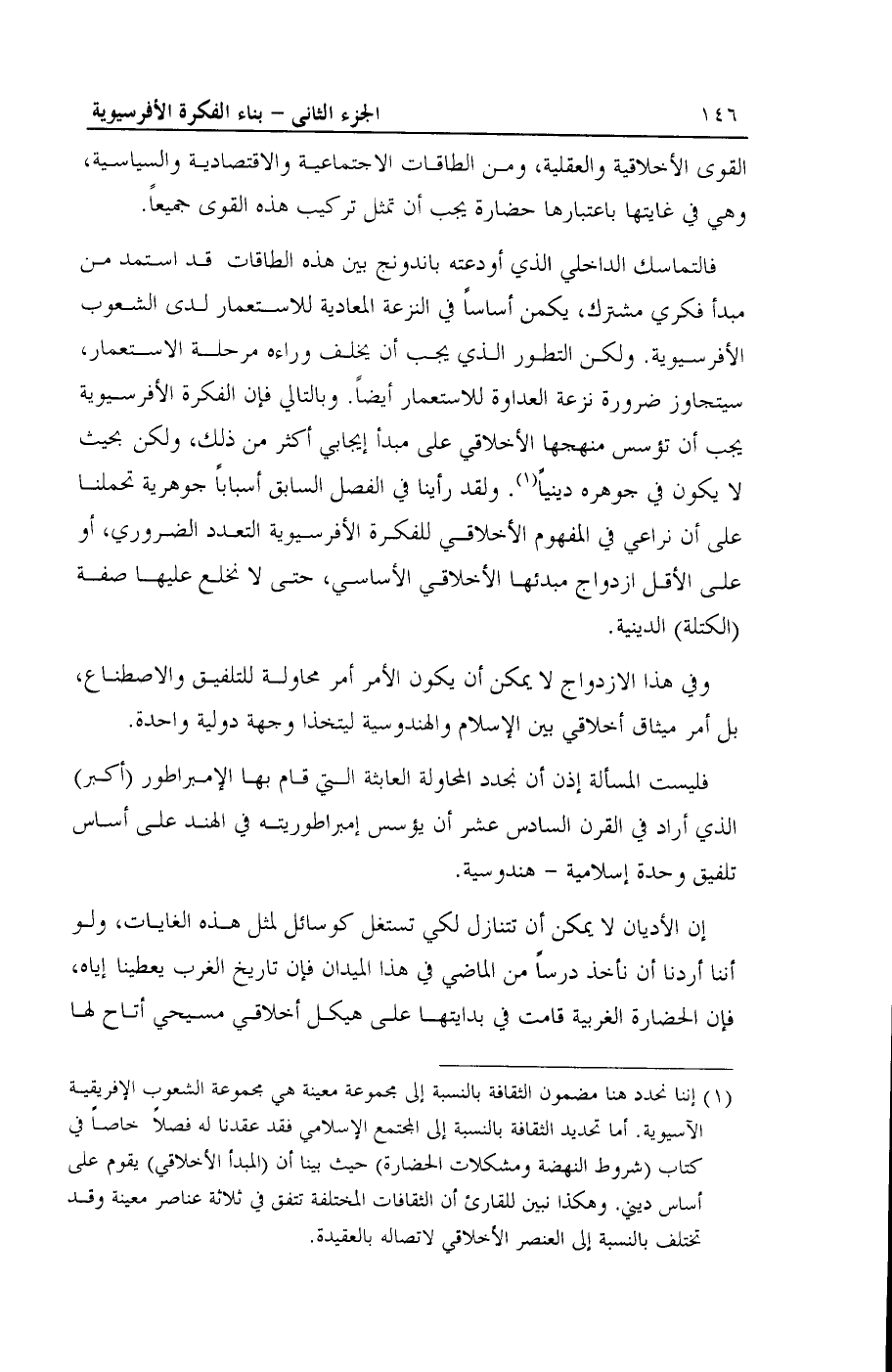 (¬1) إننا نحدد هنا مضمون الثقافة بالنسبة إلى مجموعة معينة هي مجموعة الشعوب الإفريقية الآسيوية. أما تحديد الثقافة بالنسبة إلى المجتمع الإسلامي فقد عقدنا له فصلاً خاصاً في كتاب (شروط النهضة ومشكلات الحضارة) حيث بينا أن (المبدأ الأخلاقي) يقوم على أساس ديني. وهكذا نبين للقارئ أن الثقافات المختلفة تتفق في ثلاثة عناصر معينة وقد تختلف بالنسبة إلى العنصر الأخلاقى لاتصاله بالعقيدة.