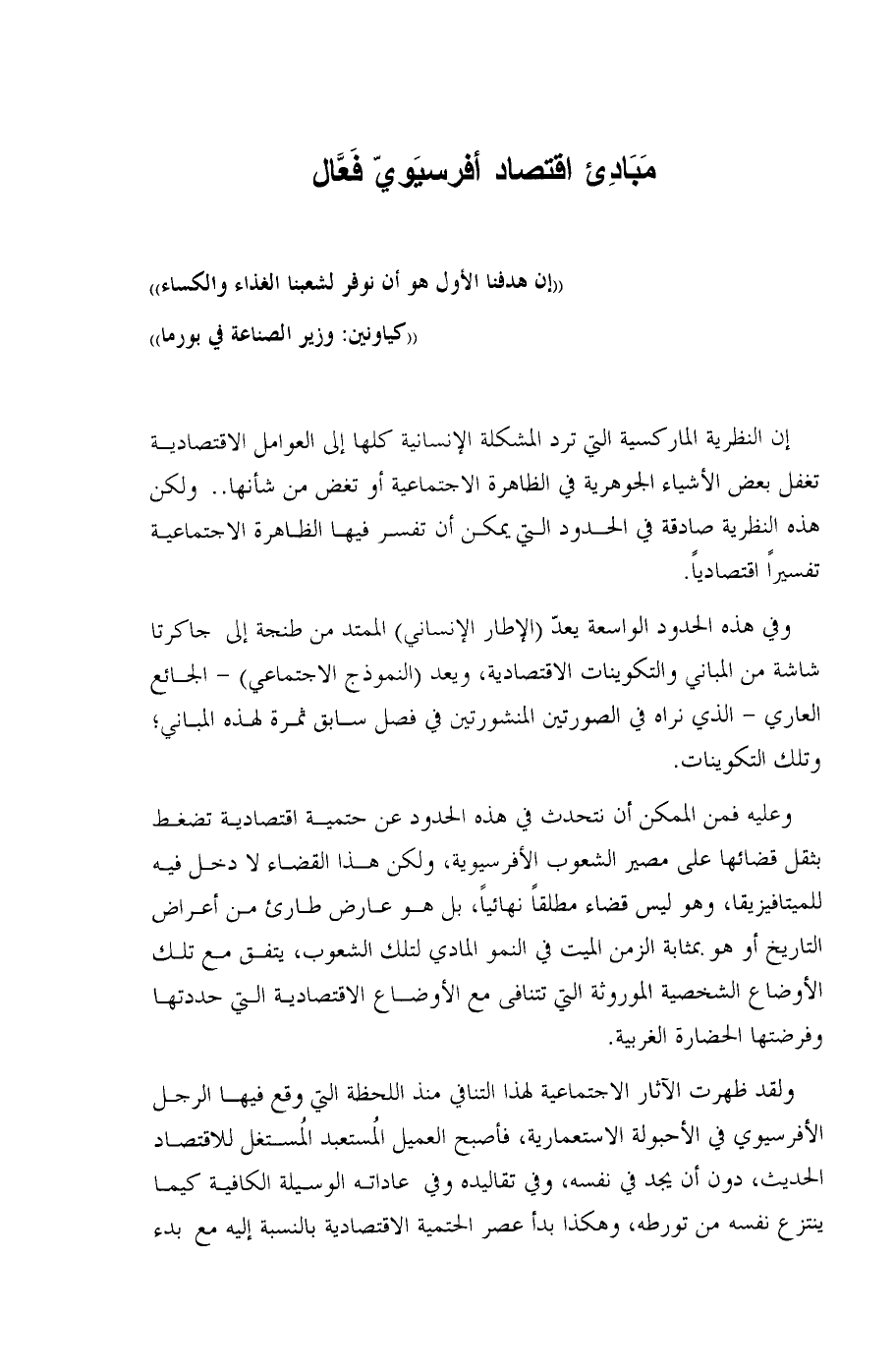 وفي هذه الحدود الواسعة يعدّ (الإطار الإنساني) الممتد من طنجة إلى جاكرتا شاشة من المباني والتكوينات الاقتصادية، ويعد (النموذج الاجتماعي) - الجائع العاري- الذي نراه في الصورتين المنشورتين في فصل سابق ثمرة لهذه المباني؛ وتلك التكوينات.