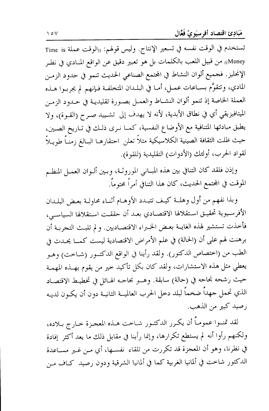 وبذا نفهم من أول وهلة كيف تتبدد الأوهام أثناء محاولة بعض البلدان الأفرسيوية تحقيق استقلالها الاقتصادي بعد أن حققت استقلالها السياسي، فأخذت تستشير لهذه الغاية بعض الخبراء الاقتصاديين. ولم تلبث التجربة أن برهنت لهم على أن (الحالة) في علم الأمراض الاقتصادية ليست كما يحدث في الطب من (اختصاص الدكتور). ولقد رأينا في الواقع الدكتور (شاخت) وهو يعطي مثل هذه الاستشارات، ولقد كان بكل تأكيد خير من يقوم بهذه المهمة حيث رشحه نجاحه في (حالة) سابقة. وهو نجاحه الهائل في تخطيط الاقتصاد الذي تحمل جهداً ضخماً لبلد دخل الحرب العالمية الثانية دون أن يكون لديه رصيد كبير من الذهب.