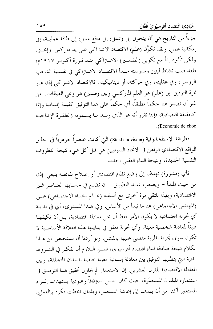 جزءاً من التاريخ هي أن يتحول إلى (عمل) إلى دافع عمل، إلى طاقة عملية، إلى إمكانية عمل، ولقد تكوَّن (علم) الاقتصاد الاشتراكي على يد ماركس وإنجلز. ولكن تأتيره بدأ مع تكوين (الضمير) الاشتراكي منذ ثورة أكتوبر 1917 م، فلقد صب نشاط لينين ومدرسته مبدأ الاقتصاد الاشتراكي في نفسية الشعب الروسي، وفي عقليته، وفي حركته، أو ديناميكيته. فالاقتصاد الاشتراكي إذن هو ثمرة التوفيق بين (علم) هو العلم الماركسي وبين (ضمير) هو وعي الطبقات. من غير أن نصدر هنا حكماً مطلقاً، أي حكماً على هذا التوفيق كقيمة إنسانية وإنما كحقيقة اقتصادية، فإننا نقرر أنه هو الذي ولَّد ما يسمونه (الطفرة الإنتاجية Economie de choc).