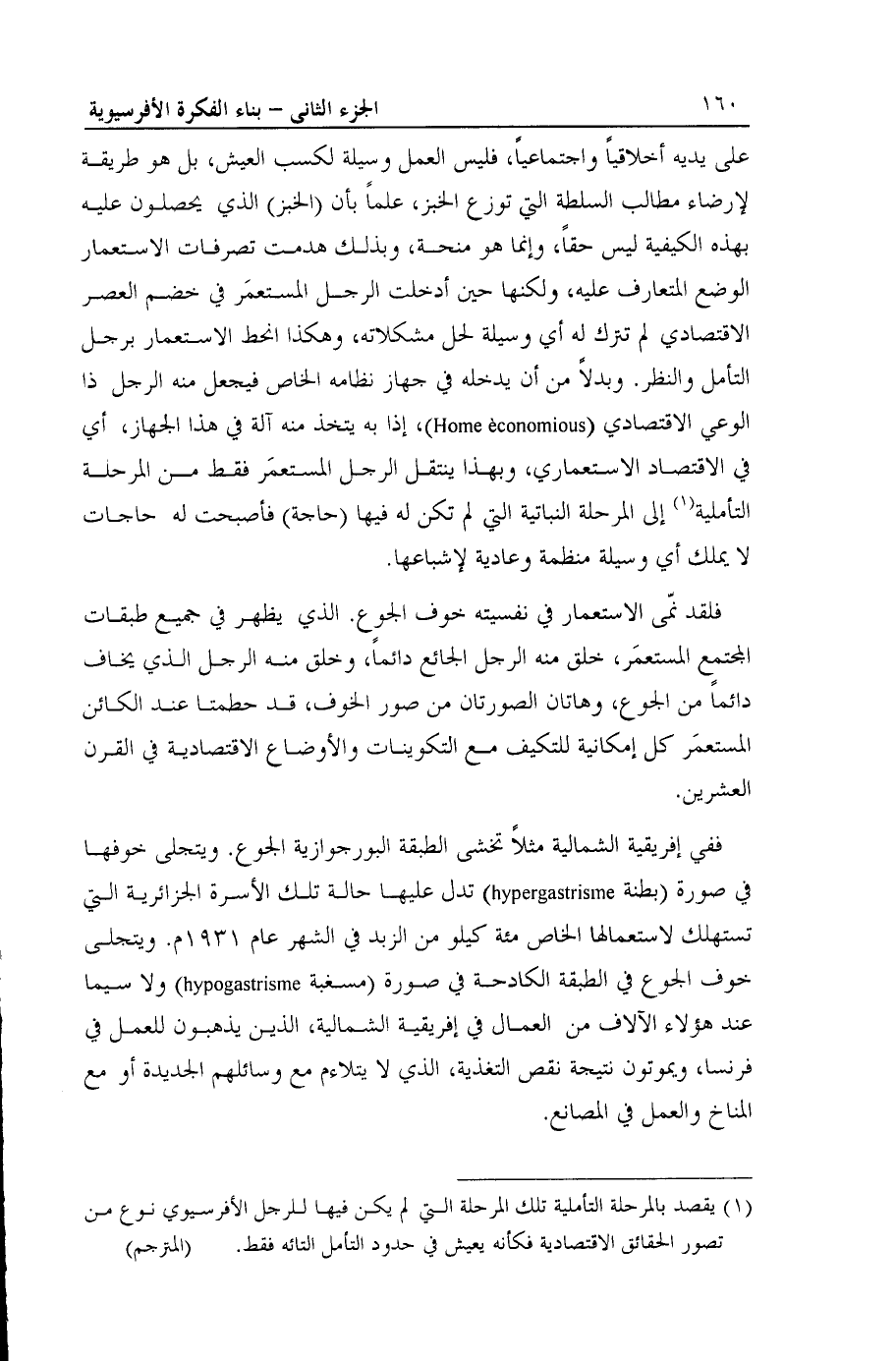 ففي إفريقية الشمالية مثلاً تخشى الطبقة البورجوازية الجوع. ويتجلى خوفها في صورة (بطنة hypergastrisme) تدل عليها حالة تلك الأسرة الجزائرية التي تستهلك لاستعمالها الخاص مئة كيلو من الزبد في الشهر عام 1931م. ويتجلى خوف الجوع في الطبقة الكادحة في صورة (مسغبة hypogastrisme) ولا سيما عند هؤلاء الآلاف من العمال في إفريقية الشمالية، الذين يذهبون للعمل في فرنسا، ويموتون نتيجة نقص التغذية، الذي لا يتلاءم مع وسائلهم الجديدة أو مع المناخ والعمل في المصانع.