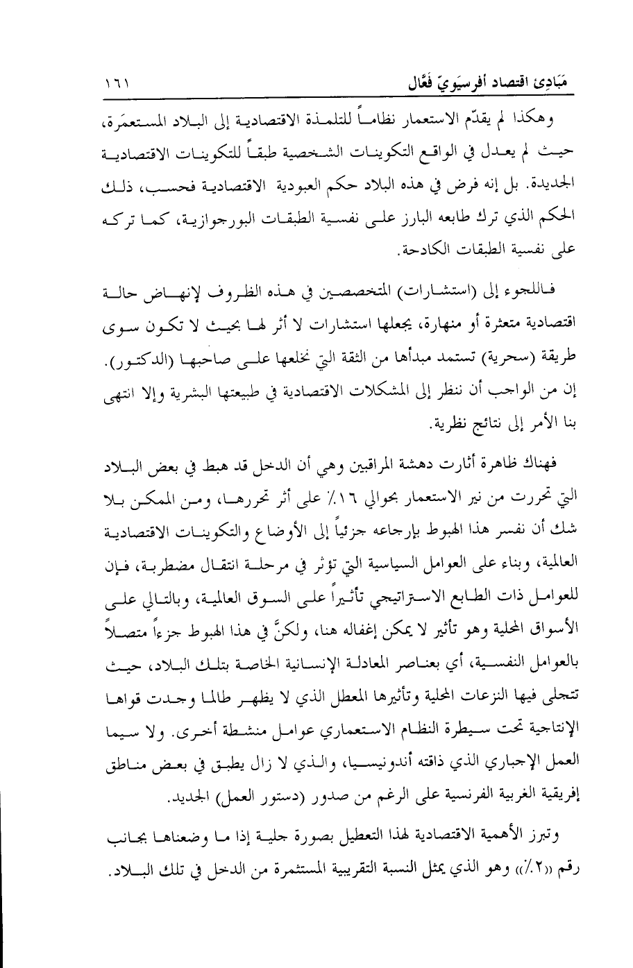 وهكذا لم يقدّم الاستعمار نظاماً للتلمذة الاقتصادية إلى البلاد المستعمَرة، حيث لم يعدل في الواقع التكوينات الشخصية طبقا للتكوينات الاقتصادية الجديدة. بل إنه فرض في هذه البلاد حكم العبودية الاقتصادية فحسب، ذلك الحكم الذي ترك طابعه البارز على نفسية الطبقات البورجوازية، كما تركه على نفسية الطبقات الكادحة.