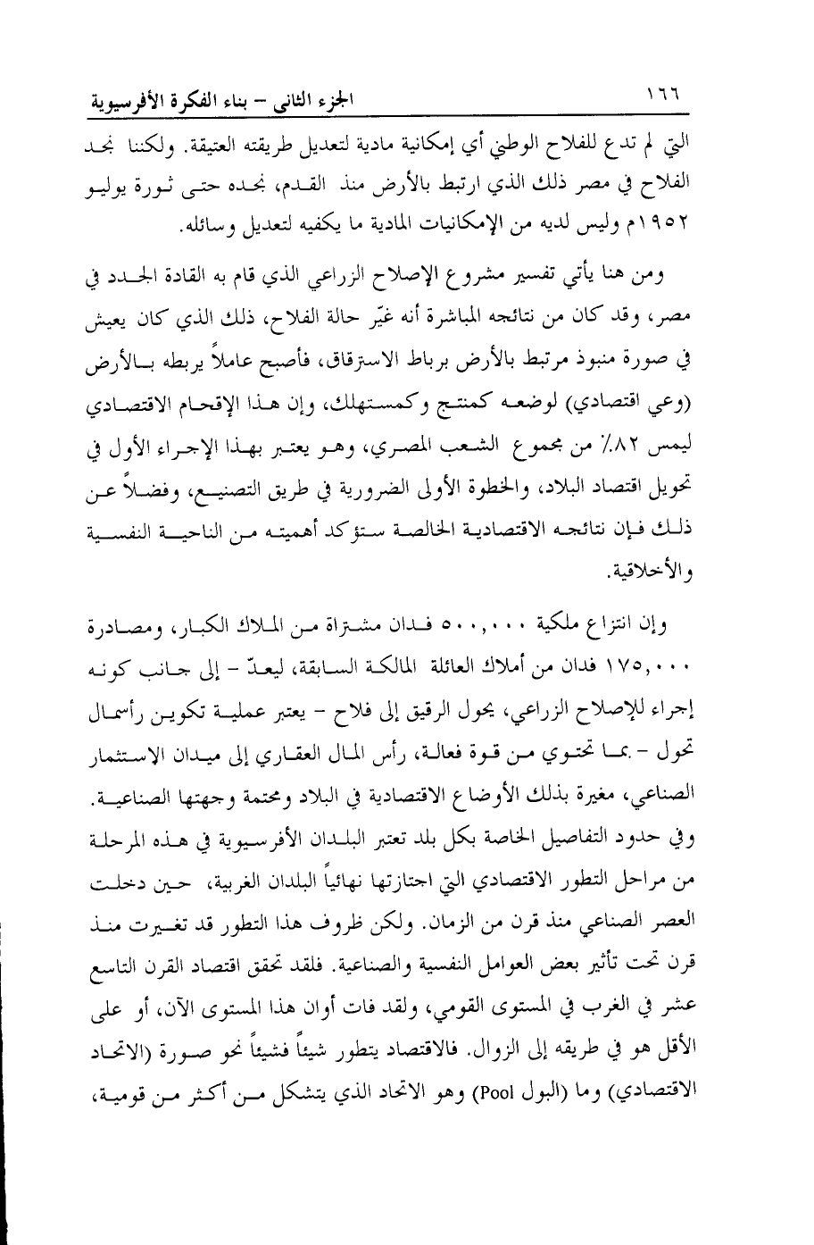 وإن انتزاع ملكية 500،000 فدان مشتراة من الملاك الكبار، ومصادرة 175،000 فدان من أملاك العائلة المالكة السابقة، ليعدّ- إلى جانب كونه إجراء للإصلاح الزراعي، يحول الرقيق إلى فلاح- يعتبر عملية تكوين رأسمال تحول- بما تحتوي من قوة فعالة، رأس المال العقاري إلى ميدان الاستثمار الصناعي، مغيرة بذلك الأوضاع الاقتصادية في البلاد ومحتمة وجهتها الصناعية. وفي حدود التفاصيل الخاصة بكل بلد تعتبر البلدان الأفرسيوية في هذه المرحلة من مراحل التطور الاقتصادي التي اجتازتها نهائياً البلدان الغربية، حين دخلت العصر الصناعى منذ قرن من الزمان. ولكن ظروف هذا التطور قد تغيرت منذ قرن تحت تأثير بعض العوامل النفسية والصناعية. فلقد تحقق اقتصاد القرن التاسع عشر في الغرب في المستوى القومي، ولقد فات أوان هذا المستوى الآن، أو على الأقل هو في طريقه إلى الزوال. فالاقتصاد يتطور شيئاً فشيئاً نحو صورة (الاتحاد الاقتصادي) وما (البول Pool) وهو الاتحاد الذي يتشكل من أكثر من قومية،