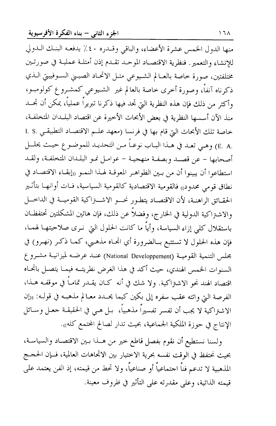 منها الدول الخمس عشرة الأعضاء، والباقي وقدره 40% يدفعه البنك الدولي للإنشاء والتعمير. فنظرية الاقتصاد الموحد تقدم إذن أمثلة عملية في صورتين مختلفتين، صورة خاصة بالعالم الشيوعي مثل الاتحاد الصيني السوفييتي الذي ذكرناه آنفاً، وصورة أخرى خاصة بالعالم غير الشيوعي كمشروع كولومبو، وأكثر من ذلك فإن هذه النظرية التي تجد فيها ذكرنا تبريراً عملياً، يمكن أن تجد منذ الآن أسسها النظرية في بعض الأبحاث الأخيرة عن اقتصاد البلدان المتخلفة، خاصة تلك الأبحاث التي قام بها في فرنسا (معهد علم الاقتصاد التطبيقي I.S.E.A) وهي تعد في هذا الباب نوعاً من التحديد للموضوع حيث يحلل أصحابها- عن قصد وبصفة منهجية- عوامل نمو البلدان المتخلفة، ولقد استطاعوا أن يبينوا أن من بين الظواهر المعوقة لهذا النمو ((إبقاء الاقتصاد في نطاق قومي محدود)) فالقومية الاقتصادية كالقومية السياسية، فات أوانها بتأثير الحقائق الراهنة، لأن الاقتصاد يتطور نحو الاشتراكية القومية في الداخل والاشتراكية الدولية في الخارج، وفضلاً عن ذلك، فإن هاتين المشكلتين تحتفظان باستقلال كلي إزاء السياسة، وأياً ما كانت الحلول التي نرى صلاحيتها لهما، فإن هذه الحلول لا تستتبع بالضرورة أي اتجاه مذهبي، كما ذكر (نهرو) في مجلس التنمية القومية ( National Developpement) عند عرضه لميزانية مشروع السنوات الخمس الهندي، حيث أكد في هذا الغرض نظريته فيما يتصل باتجاه اقتصاد الهند نحو الاشتراكية. ولا شك في أنه كان يقدر تماماً في موقفه هذا، الفرصة التي واتته عقب سفره إلى بكين كيما يحدد معالم مذهبه في قوله: ((إن الاشتراكية لا يجب أن تفسر تفسيراً مذهبياً، بل هي في الحقيقة جعل وسائل الانتاج في حوزة الملكية الجماعية، بحيث تدار لصالح المجتمع كله)).