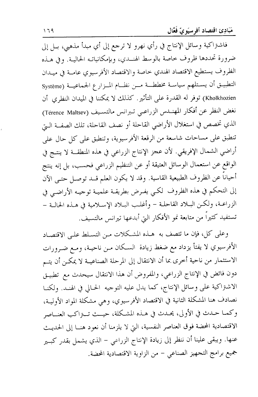 فاشتراكية وسائل الانتاج في رأي نهرو لا ترجع إلى أي مبدأ مذهي، بل إلى ضرورة تحددها ظروف خاصة بالوسط الهندي، وبإمكانياته الحالية. وفي هذه الظروف يستطيع الاقتصاد الهندي خاصة والاقتصاد الأفرسيوي عامة في ميدان التطبيق أن يستلهم سياسة مخططة من نظام المزارع الجماعية ( Système Kholkhozien) توفر له القدرة على التأثير. كذلك لا يمكننا في الميدان النظري أن نغض النظر عن أفكار المهندس الزراعي تيرانس مالتسيف ( Térence Maltsev) الذي تخصص في استغلال الأراضي القاحلة أو نصف القاحلة، تلك الصفة التي تنطبق على مساحات شاسعة من الرقعة الأفرسيوية، وتنطبق على كل حال على أراضي الشمال الافريقي. لأن عجز الإنتاج الزراعي في هذه المنطفة لا ينتج في الواقع عن استعمال الوسائل العتيقة أو عن التنظيم الزراعي فحسب، بل إنه ينتج أحياناً عن الظروف الطبيعية القاسية. وقد لا يكون العلم قد توصل حتى الآن إلى التحكم في هذه الظروف لكي يفرض بطريقة علمية توجيه الأراضي في الزراعة، ولكن البلاد القاحلة- وأغلب البلاد الإسلامية في هذه الحالة- تستفيد كثيراً من متابعة نمو الأفكار التي أبدعها تيرانس مالتسيف.