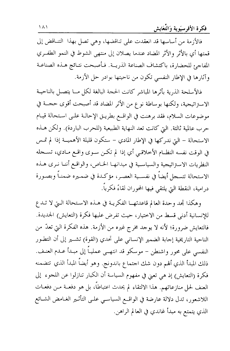 فالأسلحة الذرية بأثرها المباشر كانت الحجة البالغة لكل ما يتصل بالناحية الاستراتيجية، ولكنها بوساطة نوع من الأثر المضاد قد أصبحت أقوى حجة في موضوعات السلام، فقد برهنت في الواقع بطريق الإحالة على استحالة قيام حرب عالمية ثالثة. التي كانت تعد النهاية الطبيعية (للحرب الباردة). ولكن هذه الاستحالة- التي ندركها في الإطار المادي- ستكون قليلة الأهمية إذا لم تمس في الوقت نفسه النظام الأخلاقي أي إذا لم تكن سوى واقع مادي، تسجله النظريات الاستراتيجية والسياسية في ميدانها الخاص، والواقع أننا نرى هذه الاستحالة تتسجل أيضاً في نفسية العصر، مؤكدة في ضميره ضمناً وبصورة درامية، النقطة التي يلتقي فيها المحوران لقاءً فكرياً.