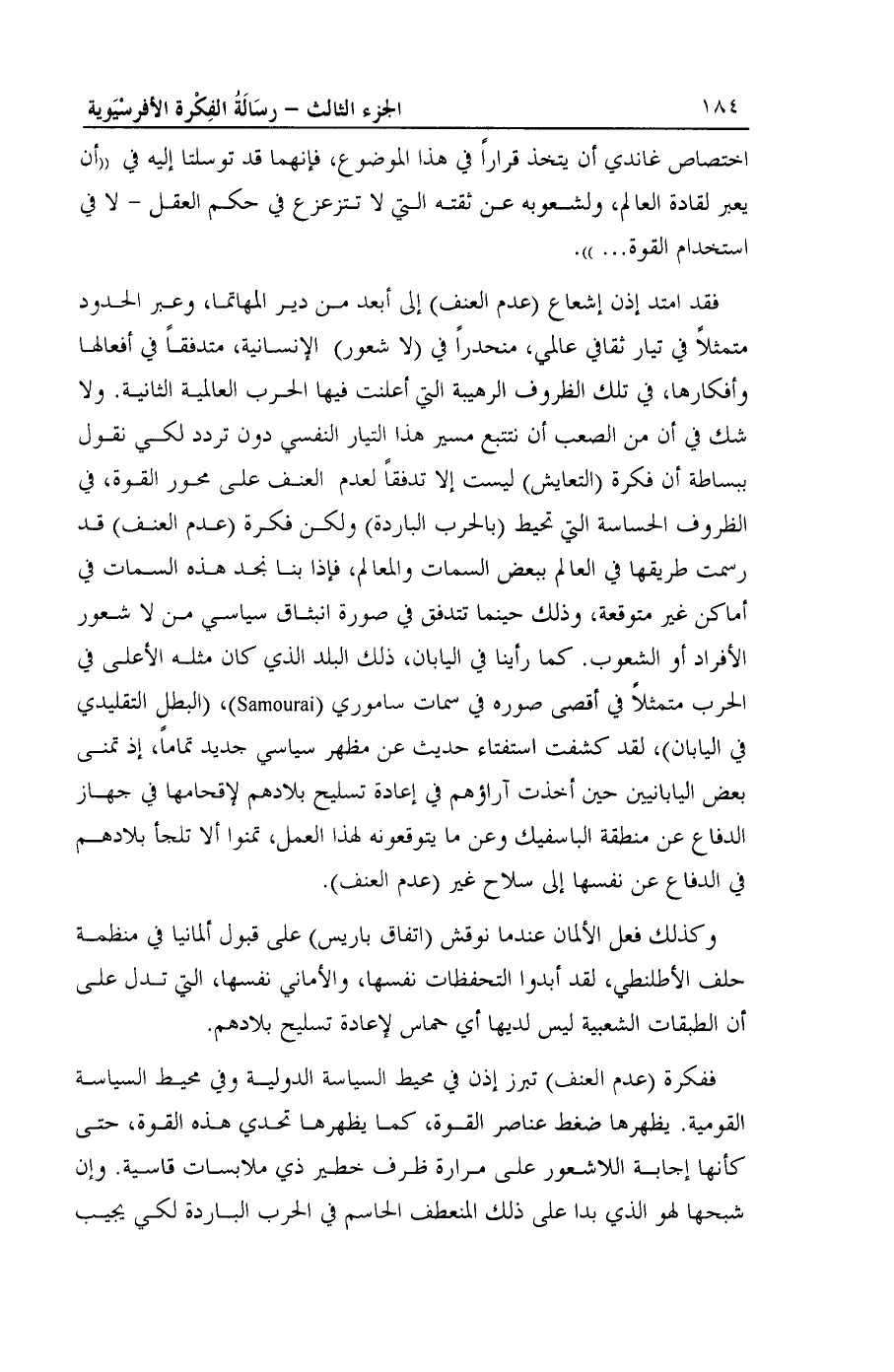 ففكرة (عدم العنف) تبرز إذن في محيط السياسة الدولية وفي محيط السياسة القومية. يظهرها ضغط عناصر القوة، كما يظهرها تحدي هذه القوة، حتى كأنها إجابة اللاشعور على مرارة ظرف خطير ذي ملابسات قاسية. وإن شبحها لهو الذي بدا على ذلك المنعطف الحاسم في الحرب الباردة لكي يجيب