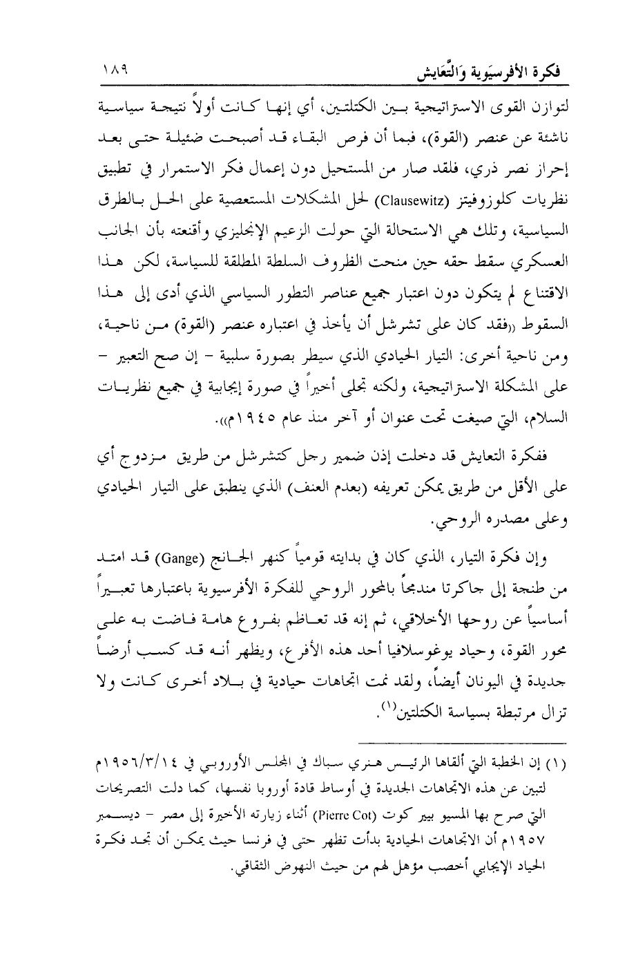 (¬1) إن الخطبة التي ألقاها الرئيس هنري سباك في المجلس الأوروبي في 14/ 3/ 1956م لتبين عن هذه الاتجاهات الجديدة في أوساط قادة أوروبا نفسها، كما دلت التصريحات التي صرح بها المسيو بيير كوت ( Pierre Cot) أثناء زيارته الأخيرة إلى مصر - ديسمبر 1957م أن الاتجاهات الحيادية بدأت تظهر حتى في فرنسا حيث يمكن أن تجد فكرة الحياد الايجابي أخصب مؤهل لهم من حيث النهوض الثقاقي.