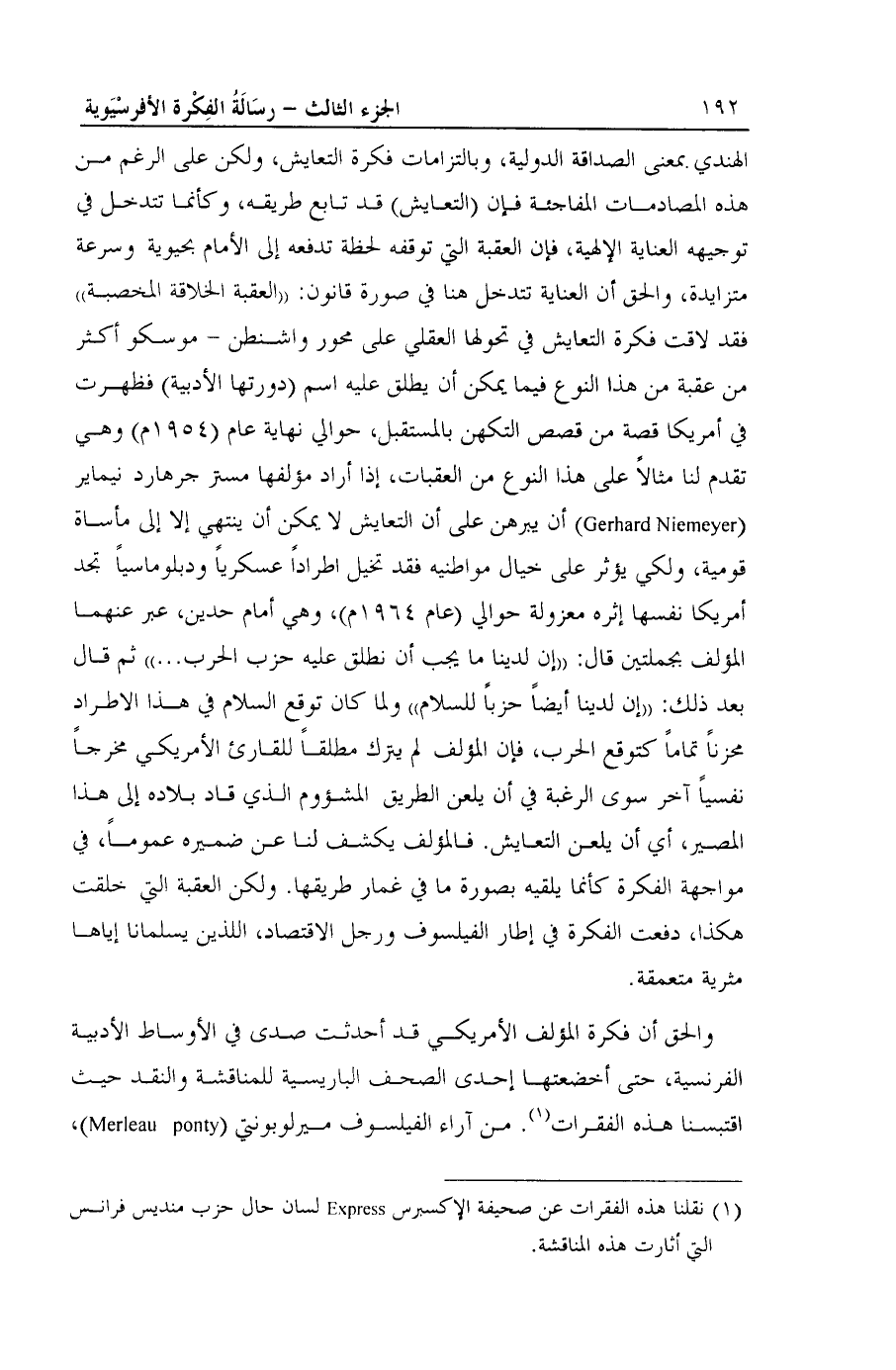 والحق أن فكرة المؤلف الأمريكي قد أحدثت صدى في الأوساط الأدبية الفرنسية، حتى أخضعتها إحدى الصحف الباريسية للمناقشة والنقد حيث اقتبسنا هذه الفقرات (¬1). من آراء الفيلسوف ميرلوبونتي ( Merleau ponty) ،