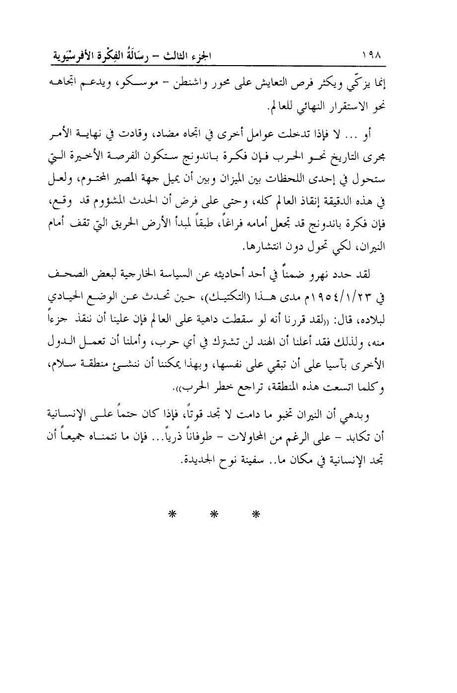 أو ... لا فإذا تدخلت عوامل أخرى في اتجاه مضاد، وقادت في نهاية الأمر مجرى التاريخ نحو الحرب فإن فكرة باندونج ستكون الفرصة الأخيرة التي ستحول في إحدى اللحظات بين الميزان وبين أن يميل جهة المصير المحتوم، ولعل في هذه الدقيقة إنقاذ العالم كله، وحتى على فرض أن الحدث المشؤوم قد وقع، فإن فكرة باندونج قد تجعل أمامه فراغاً، طبقاً لمبدأ الأرض الحريق التي تقف أمام النيران، لكي تحول دون انتشارها.