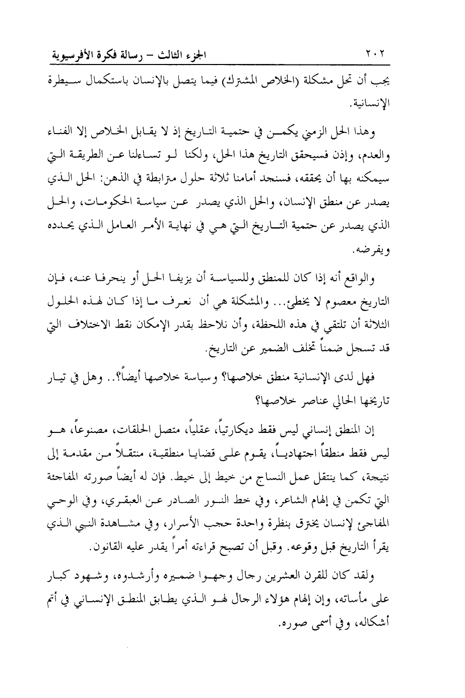 فهل لدى الإنسانية منطق خلاصها؟ وسياسة خلاصها أيضاً؟ .. وهل في تيار تاريخها الحالي عناصر خلاصها؟