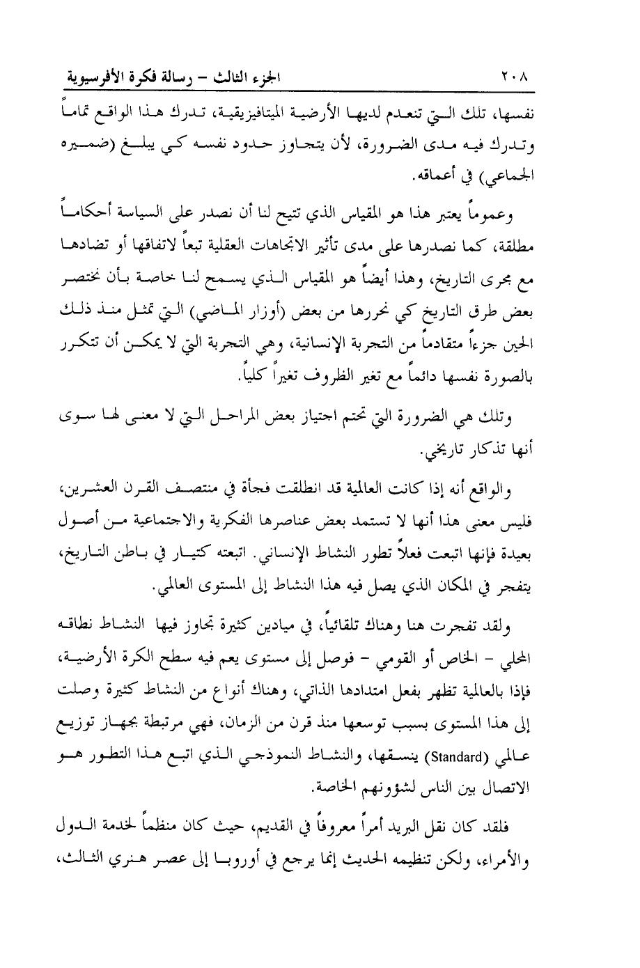 وعموماً يعتبر هذا هو القياس الذي تتيح لنا أن نصدر على السياسة أحكاماً مطلقة، كما نصدرها على مدى تأثير الاتجاهات العقلية تبعاً لاتفاقها أو تضادها مع مجرى التاريخ، وهذا أيضاً هو القياس الذي يسمح لنا خاصة بأن نختصر بعض طرق التاريخ كي نحررها من بعض (أوزار الماضي) التي تمثل منذ ذلك الحين جزءاً متقادماً من التجربة الإنسانية، وهي التجربة التي لا يمكن أن تتكرر بالصورة نفسها دائماً مع تغير الظروف تغيراً كلياً.