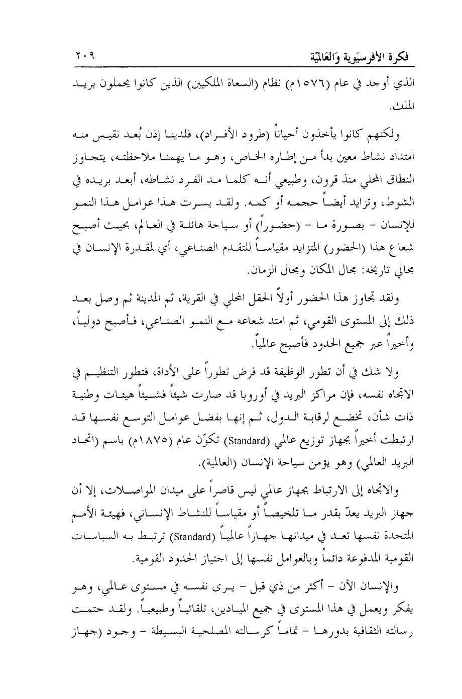 والإنسان الآن- أكثر من ذي قبل- يرى نفسه في مستوى عالمي، وهو يفكر ويعمل في هذا المستوى في جميع الميادين، تلقائياً وطبيعياً. ولقد حتمت رسالته الثقافية بدورها- تماماً كرسالته المصلحية البسيطة- وجود (جهاز