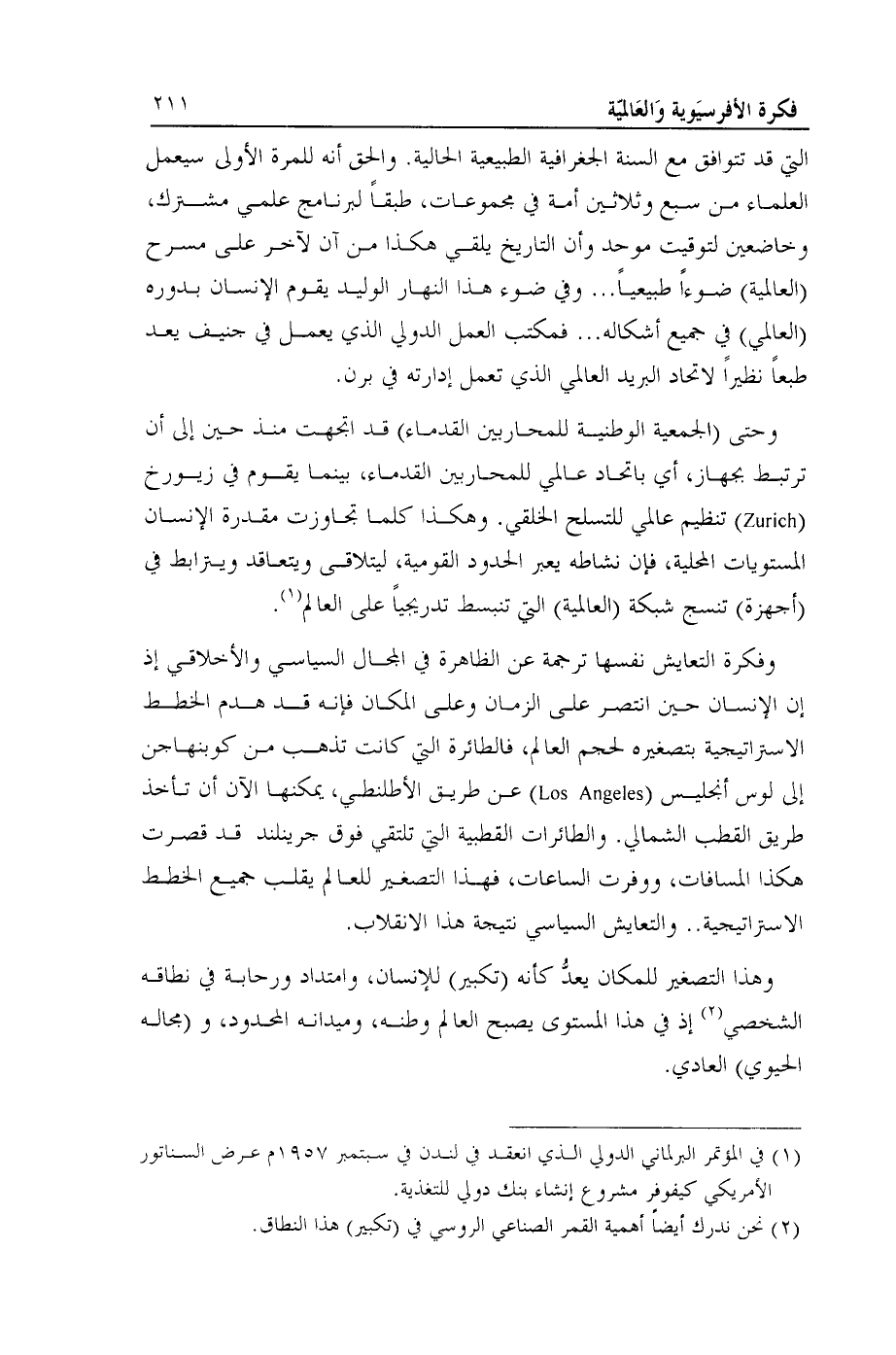 وحتى (الجمعية الوطنية للمحاربين القدماء) قد اتجهت منذ حين إلى أن ترتبط بجهاز، أي باتحاد عالمي للمحاربين القدماء، بينما يقوم في زيورخ ( Zurich) تنظيم عالمي للتسلح الخلقي. وهكذا كلما تجاوزت مقدرة الإنسان المستويات المحلية، فإن نشاطه يعبر الحدود القومية، ليتلاقى ويتعاقد ويترابط في (أجهزة) تنسج شبكة (العالمية) التي تنبسط تدريجياً على العالم (¬1).