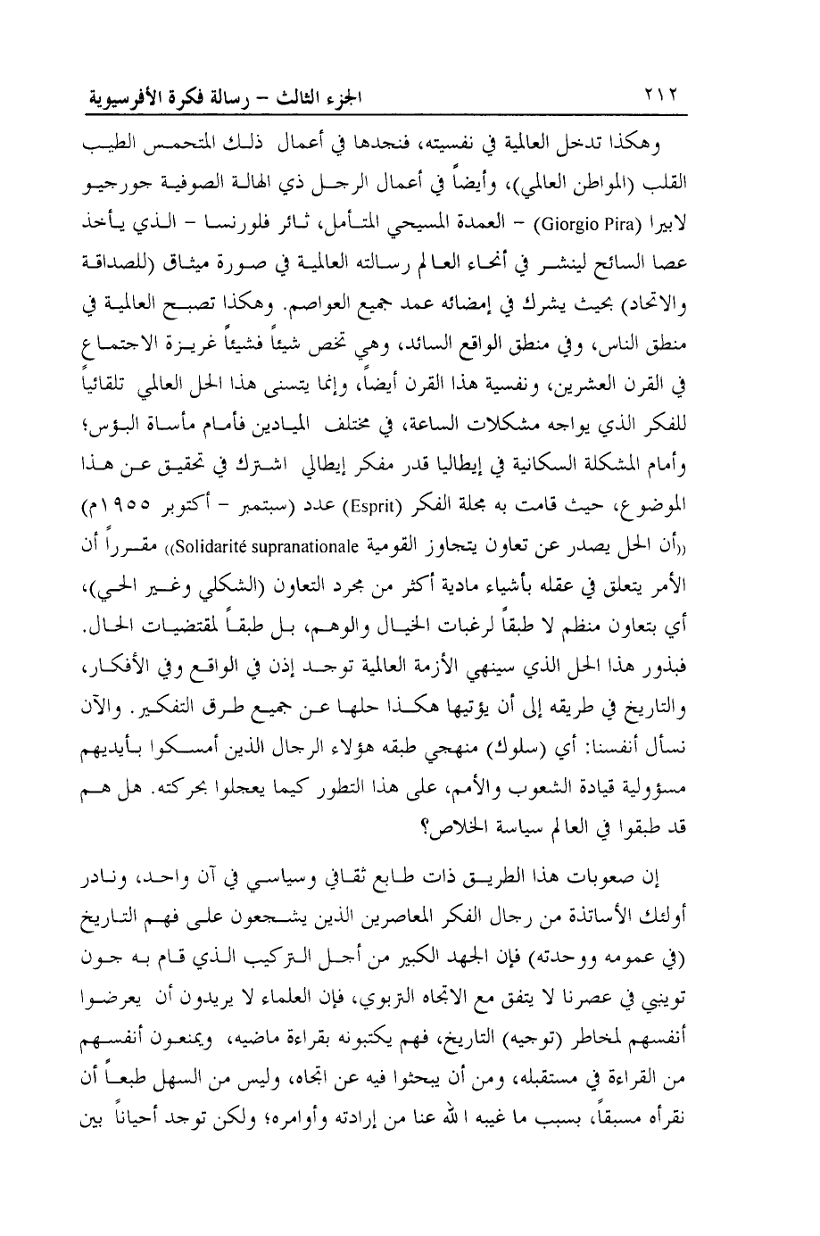 وهكذا تدخل العالمية في نفسيته، فنجدها في أعمال ذلك المتحمس الطيب القلب (المواطن العالمي)، وأيضاً في أعمال الرجل ذي الهالة الصوفية جورجيو لابيرا ( Giorgio Pira) - العمدة المسيحي المتأمل، تائر فلورنسا- الذي يأخذ عصا السائح لينشر في أنحاء العالم رسالته العالمية في صورة ميثاق (للصداقة والاتحاد) بحيث يشرك في إمضائه عمد جميع العواصم. وهكذا تصبح العالمية في منطق الناس، وفي منطق الواقع السائد، وهي تخص شيئاً فشيئاً غريزة الاجتماع في القرن العشرين، ونفسية هذا القرن أيضاً، وإنما يتسنى هذا الحل العالمي تلقائياً للفكر الذي يواجه مشكلات الساعة، في مختلف الميادين فأمام مأساة البؤس؛ وأمام المشكلة السكانية في إيطاليا قدر مفكر إيطالي اشترك في تحقيق عن هذا الموضوع، حيث قامت به مجلة الفكر ( Esprit) عدد (سبتمبر- أكثربر 1955م) ((أن الحل يصدر عن تعاون يتجاوز القومية Solidarité supranationale)) مقرراً أن الأمر يتعلق في عقله بأشياء مادية أكثر من مجرد التعاون (الشكلي وغير الحي)، أي بتعاون منظم لا طبقاً لرغبات الخيال والوهم، بل طبقاً لمقتضيات الحال. فبذور هذا الحل الذي سينهي الأزمة العالمية توجد إذن في الواقع وفي الأفكار، والتاريخ في طريقه إلى أن يؤتيها هكذا حلها عن جميع طرق التفكير. والآن نسأل أنفسنا: أي (سلوك) منهجي طبقه هؤلاء الرجال الذين أمسكوا بأيديهم مسؤولية قيادة الشعوب والأمم، على هذا التطور كيما يعجلوا بحركته. هل هم قد طبقوا في العالم سياسة الخلاص؟
