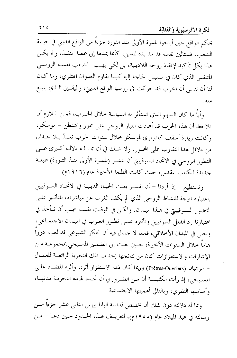 ونستطيع- إذا أردنا- أن نفسر بعث الحياة الدينية في الاتحاد السوفييتي باعتباره نتيجة للنشاط الروحي الذي لم يكف الغرب عن مباشرته، للتأتير على التطور السوفييتي في هذا الميدان. ولكن في الوقت نفسه يجب أن نأخذ في اعتبارنا رد الفعل السوفييتي وتأثيره على تطور الغرب في الميدان الاجتماعي، وحتى في الميدان الأخلاقي، فمما لا جدال فيه أن الفكر الشيوعي قد لعب دورًا هاماً خلال السنوات الأخيرة، حين بعث إلى الضمير المسيحي بمجموعة من الاشارات والاستفزازات كان من نتائجها إحداث تلك التجربة الرائعة للعمال - الرهبان ( Prêtres-Ouvriers) وربما كان لهذا الاستفزاز أثره، وأثره المضاد على المسيحي، إذ رأت الكنيسة أن من الضروري أن تحدد لهذه التجربة مدتها، وأساسها النظري، وبالتالي أهميتها الاجتماعية.