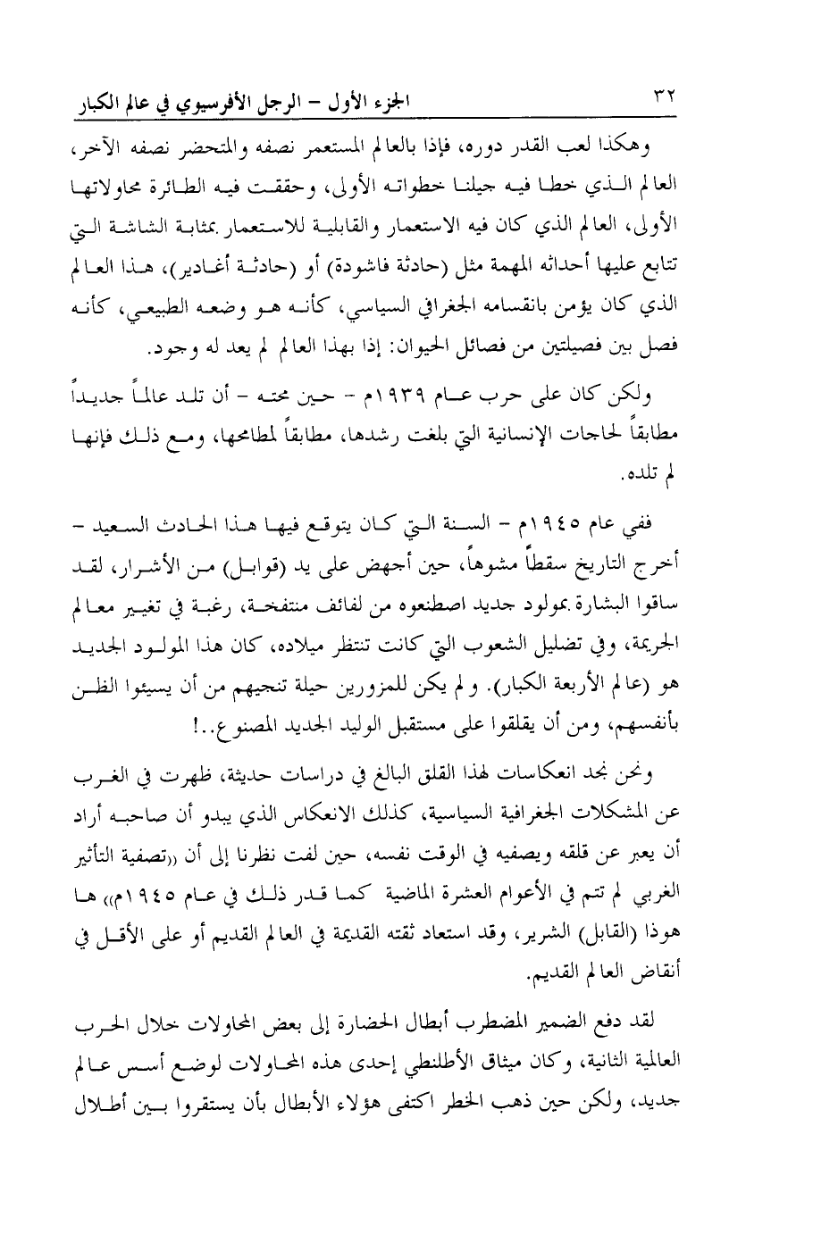 وهكذا لعب القدر دوره، فإذا بالعالم المستعمر نصفه والمتحضر نصفه الآخر، العالم الذي خطا فيه جيلنا خطواته الأولى، وحققت فيه الطائرة محاولاتها الأولى، العالم الذي كان فيه الاستعمار والقابلية للاستعمار بمثابة الشاشة التي تتابع عليها أحداثه المهمة مثل (حادثة فاشودة) أو (حادثة أغادير)، هذا العالم الذي كان يؤمن بانقسامه الجغرافي السياسي، كأنه هو وضعه الطبيعي، كأنه فصل بين فصيلتين من فصائل الحيوان: إذا بهذا العالم لم يعد له وجود.